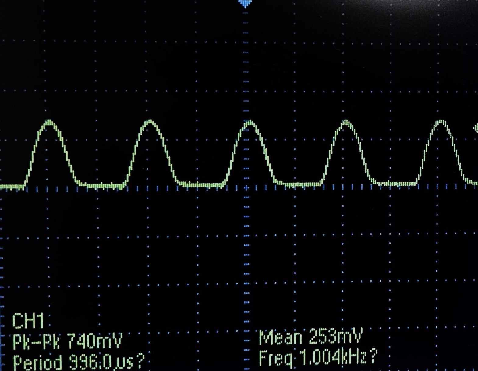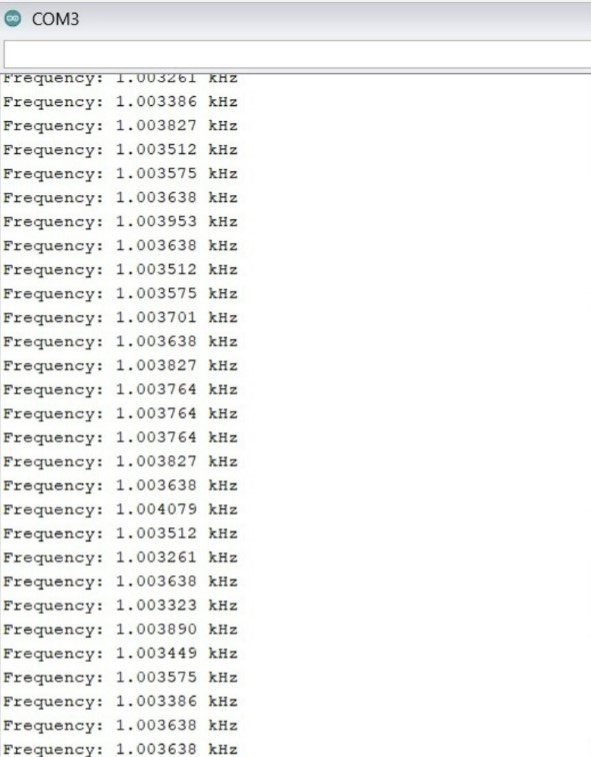 Thirdly, the previously built phototransistor's circuit output was connected to the analog pin A1 of the Nano Every board on the robotframe. The integrated peripherals analog comparator and TCB of the Nano were used to measured the frequency of the IR signal. The measured frequencies were displayed on the serial monitor (Fig. 3) withthe signal generator set to 1kHz. It is worth mentioning that we built off our implementation from the AC_readPhototran code provided in lecture. Upon testing the one phototransistor circuit, the other two phototransistor circuits were completed. Each cicuit was connected to an individual analog pin on the Nano. For testing, the code was updated to cycle through each phototransistor and determine if there was an IR signal. If present, the measured frequencies were displayed on the serial monitor.