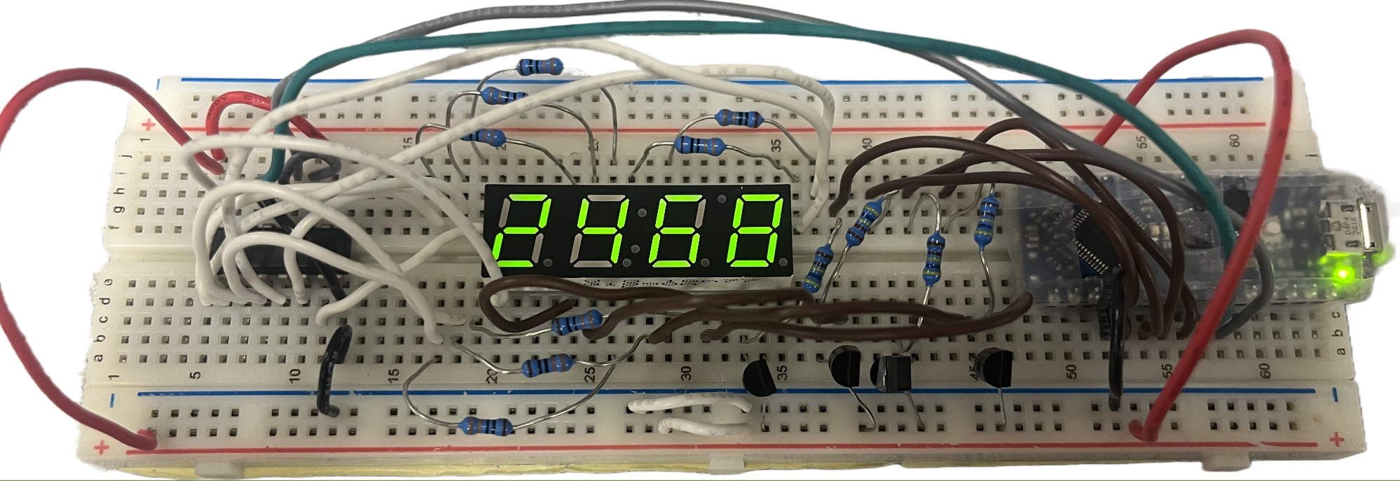 In this section of the lab, the shift register, 7-segment display circuit was built as shown below. The outputs of the 7-segment display were connected pins D2-D8 on the Nano.