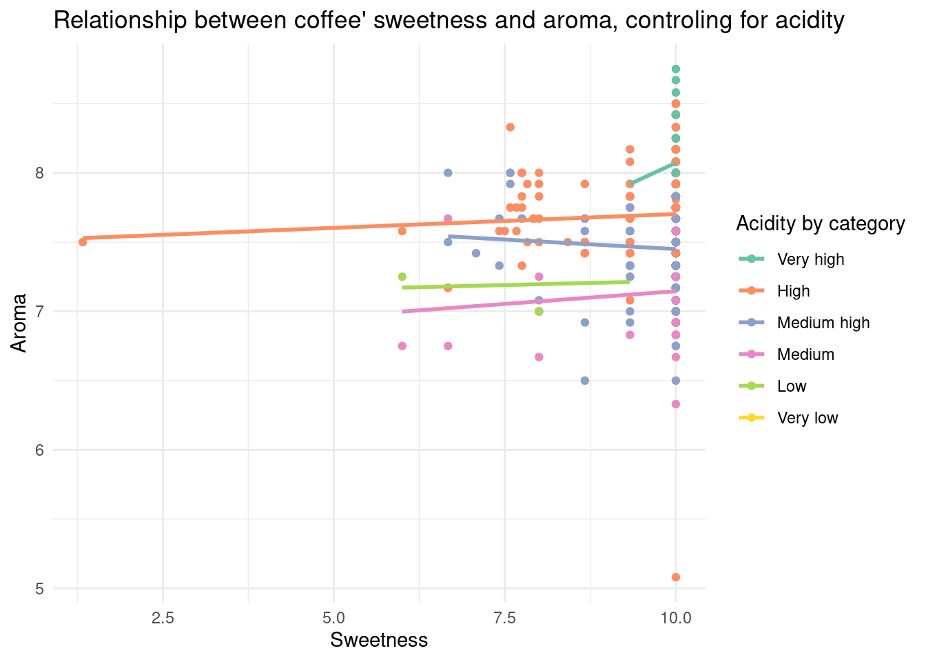 To better visualize the relationship, I categorized the coffee acidity scores into different categories. Then I plotted the relationship between coffee aroma and sweetness controlling for the acidity category. The graph shows that there are hardly any relationships between sweetness and aroma for each acidity category. Some regression lines are slightly positive, and there’s also one regression that is negative. The only category that shows some kind of relationship is the coffee with Very High acidity, but there are only a few samples.