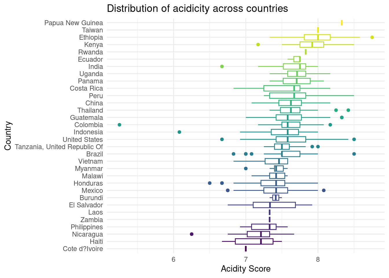 However, according to the boxplots that present the median and ranges of aroma and acidity scores for coffee types of each country, we can see that there is a clear positive relationship between acidity and aroma with the country that a coffee type originates from. For example, Papa New Guinea has the highest scores for acidity and aroma for the coffee types grown in their area. We find that for most countries, as the aroma score goes down, so does the acidity score, and vice versa. However, these scores are contained in a close range, as a majority of the coffee types in the data set have acidity and aroma levels in between 7 and 8.