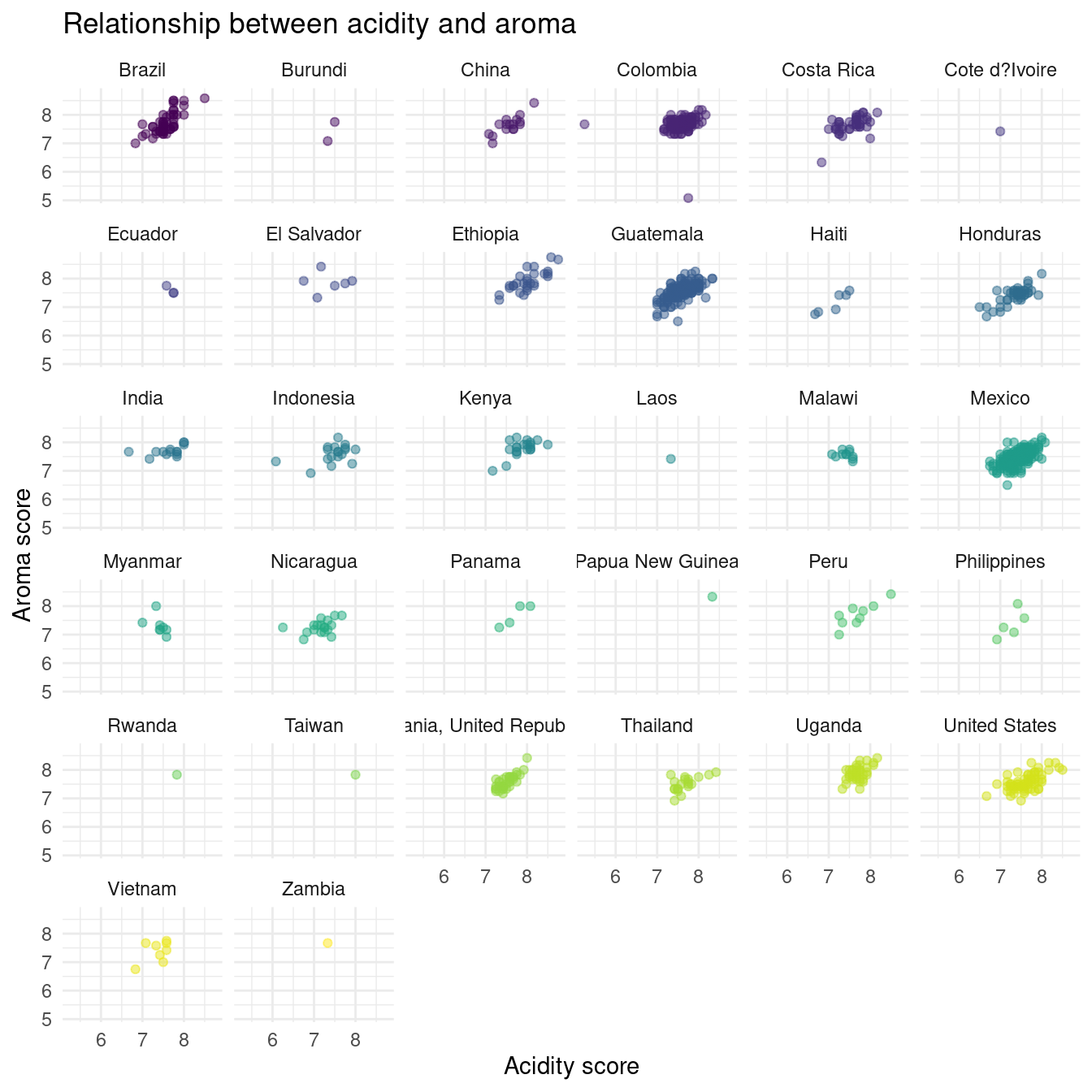 In this graph, we see a relatively strong positive linear relationship between acidity and aroma across each country.