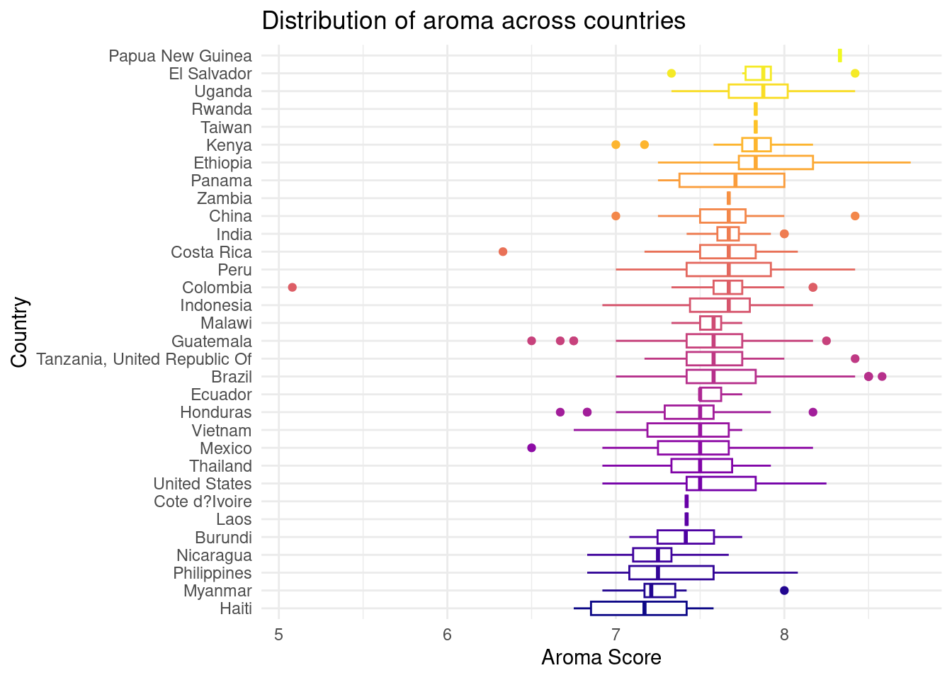 For both of the previous graphs visualizing the distribution of aroma and aciditity, we see that across the dataset, countries do have very similar mean values and similar distributions.