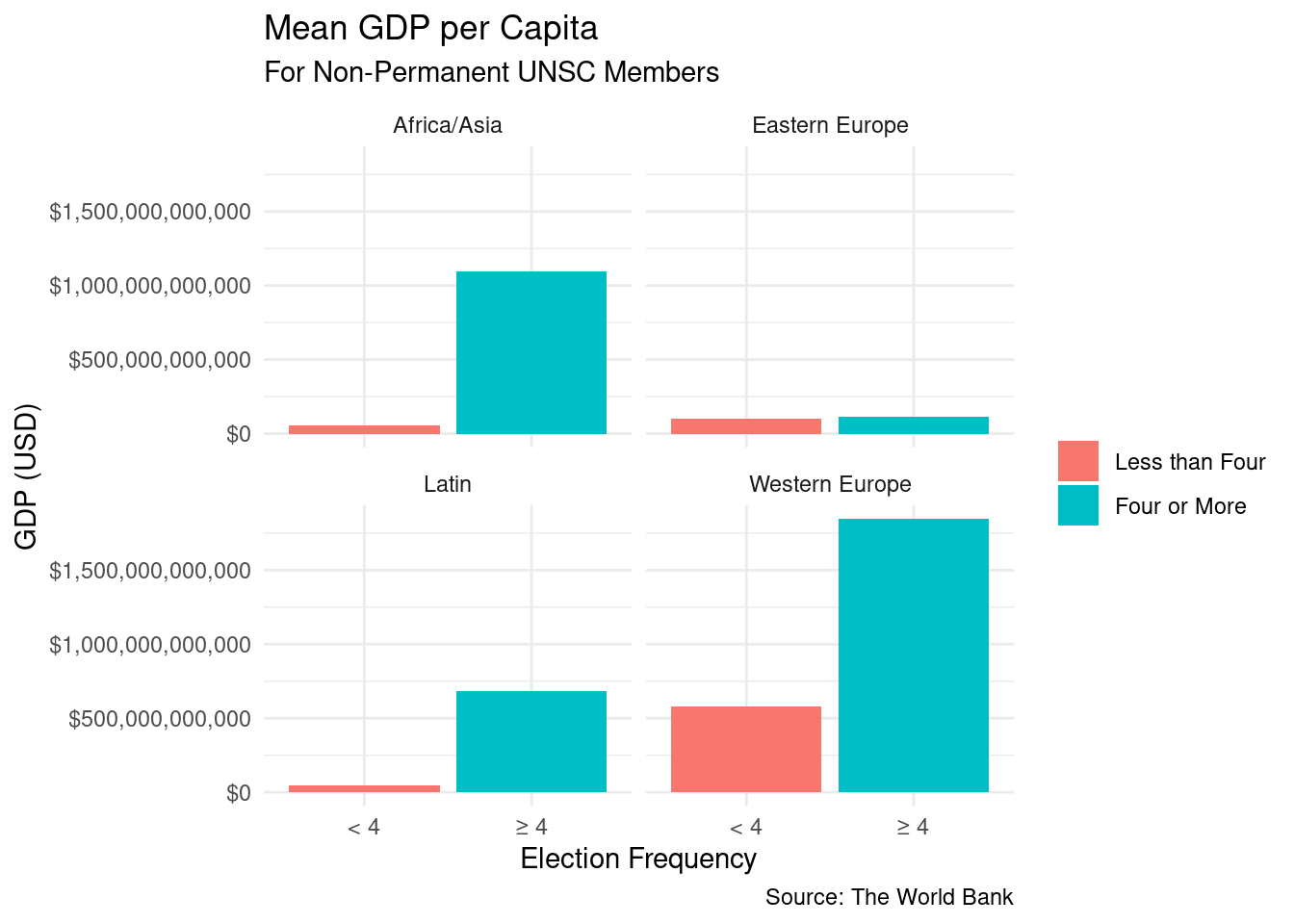 Our mean calculations revealed some intriguing patterns. The following provides more clarification on the distinctions between mean GDPs. The means for countries with four or more elections for their region are on the left and the remaining are on the right: