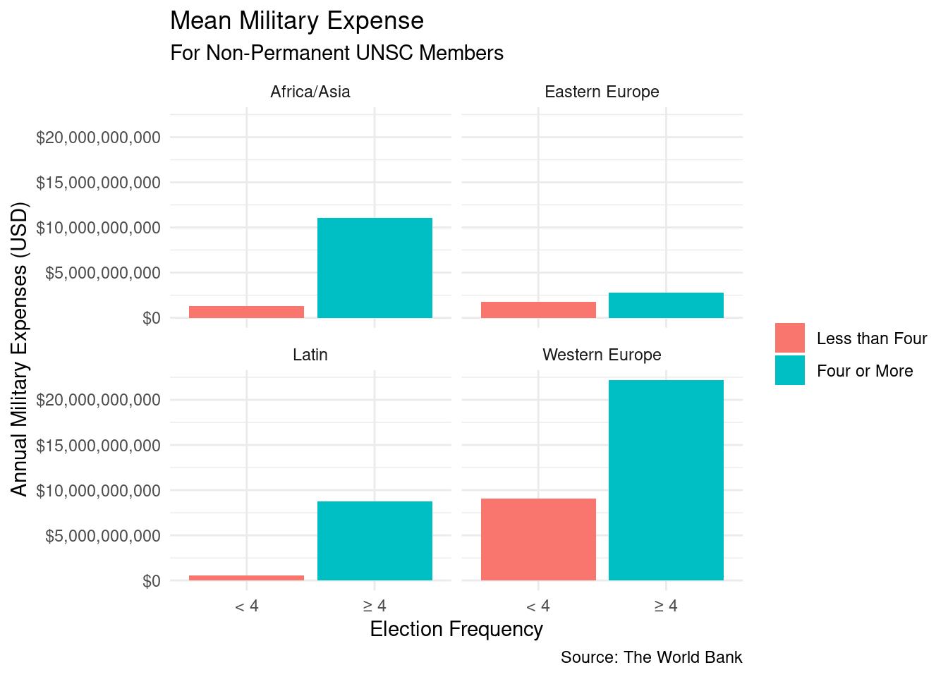 The following table illustrates the mean Military Expense of countries elected was 4 or more times versus less than 4 times in each region: