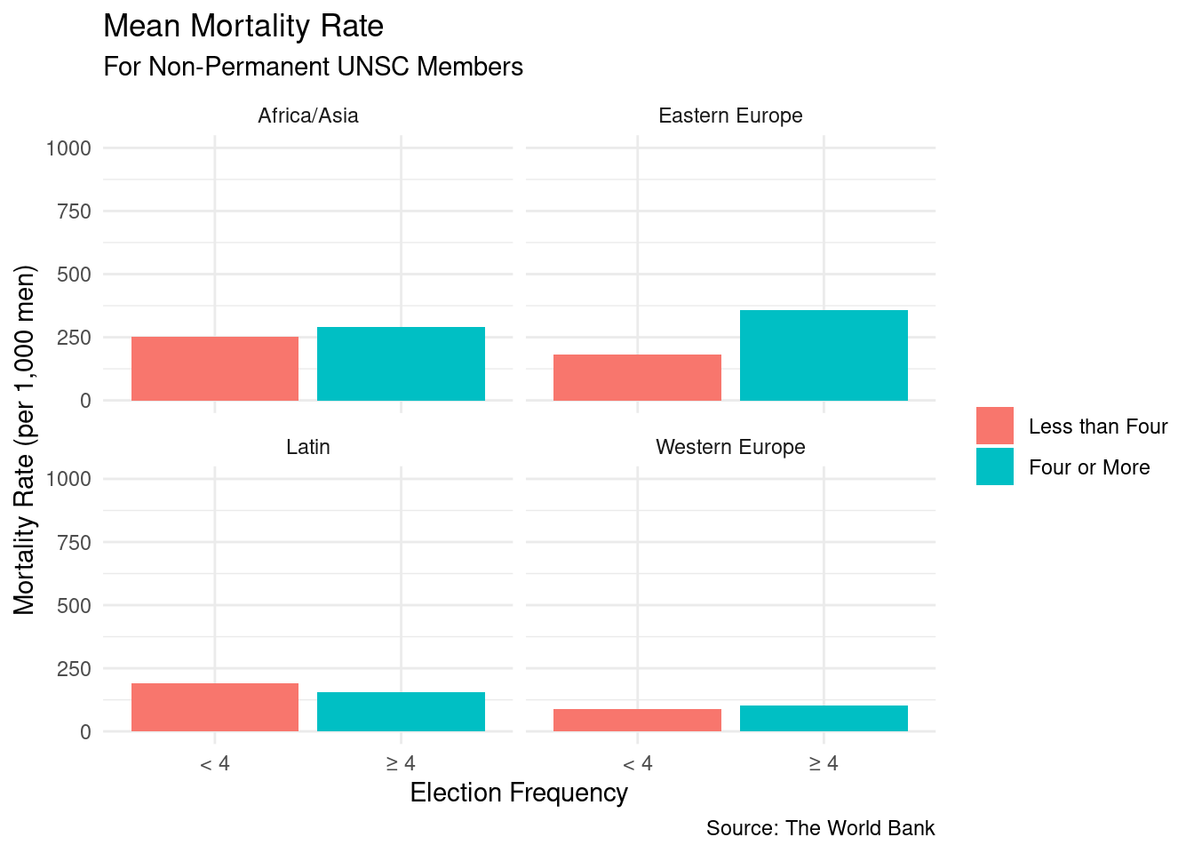 Mortality rates also varied, but differently than GDP and Military expense. We could see that there was a significant gap between the GDP and Military Expenses of countries that were elected 4 or more times and those who weren’t in each region; that pattern was consistent. However, differences in mortality rates were not consistent. In Western Europe, countries with four or more elections did have significantly higher mortality rates, but mean differences for Africa/Asia and Eastern Europe weren’t that large and in Latin America, the distinction was actually flipped. The following provides more clarification on the distinctions between mean mortality rate. The means for countries with four or more elections for their region are on the left and the remaining are on the right:
