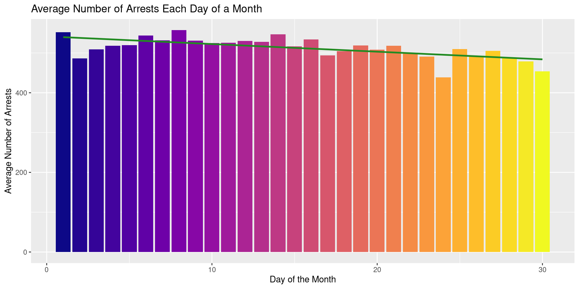 \[ \begin{split} \widehat{ARRESTS} = 541.63 + DAY \times -1.92 \end{split} \] From our model, we would expect, on average the number of arrests per day to decrease by 1.92 arrests every additional day we get in to a month.
