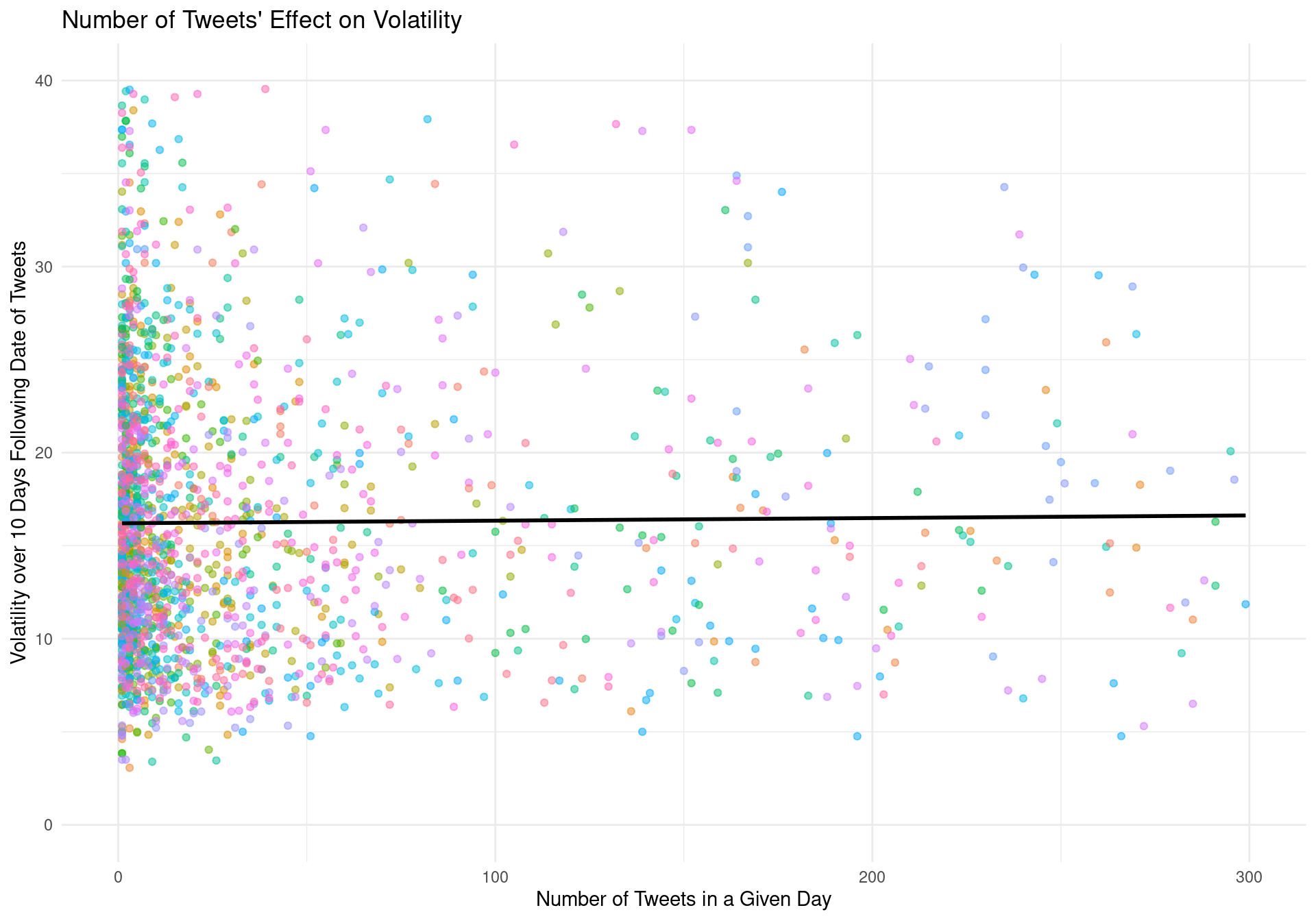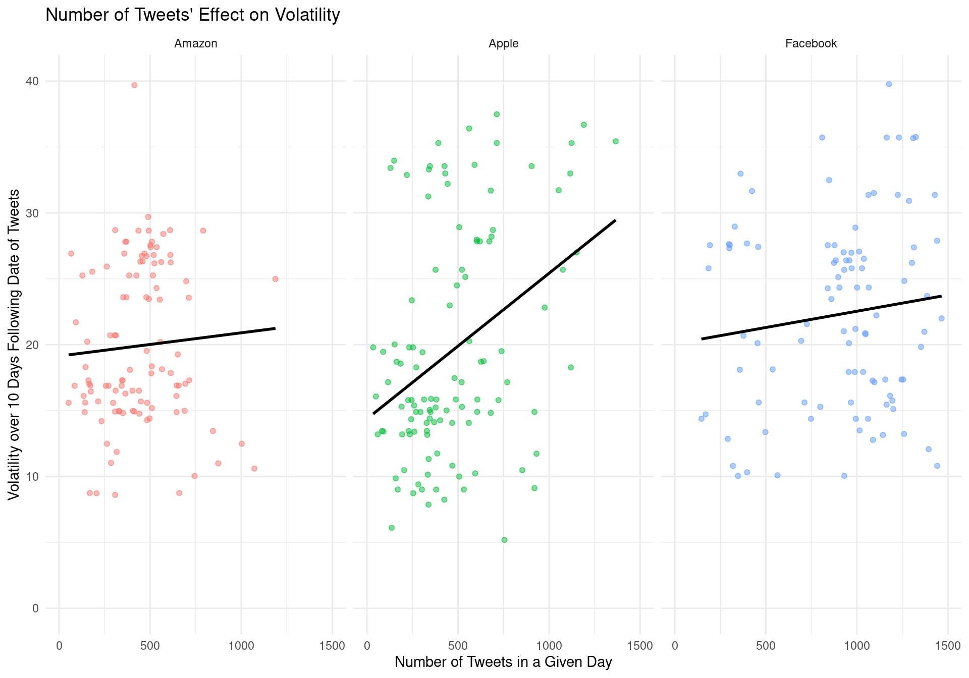Our first inference model was to find the number of tweets and their affect on the volatility on a selection of stocks across market caps.