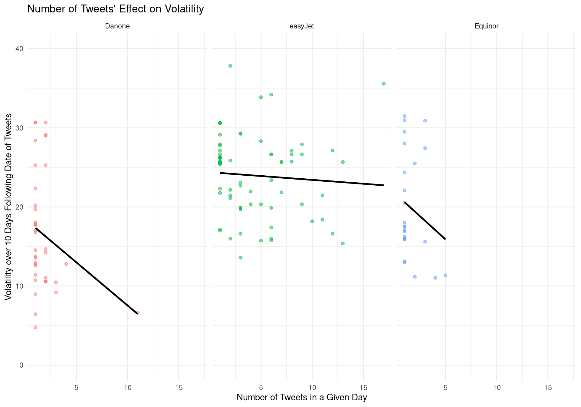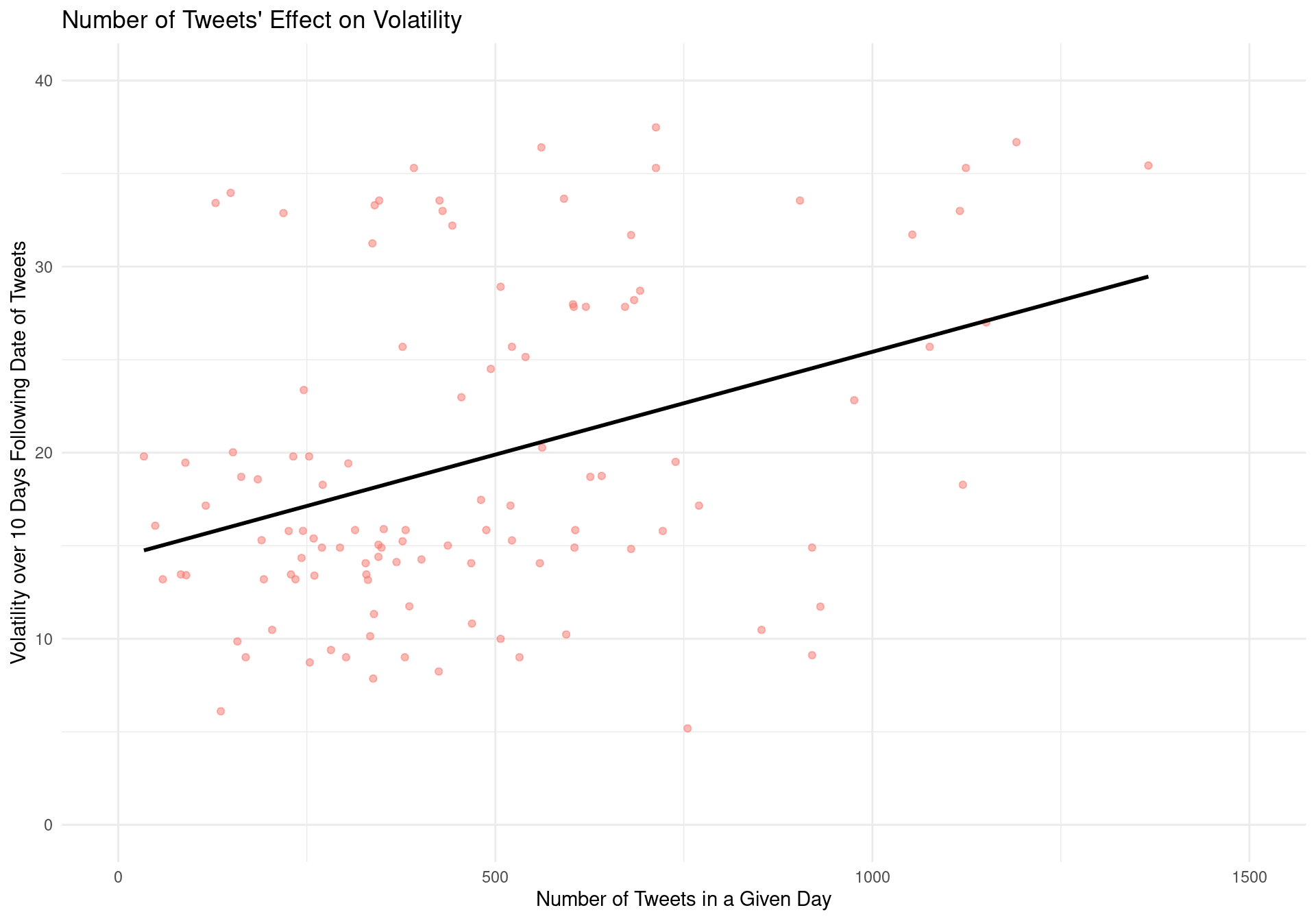 We are interested in trying to view if the volatility is affected by tweets about that particular stock and build a prediction of volatility based on this