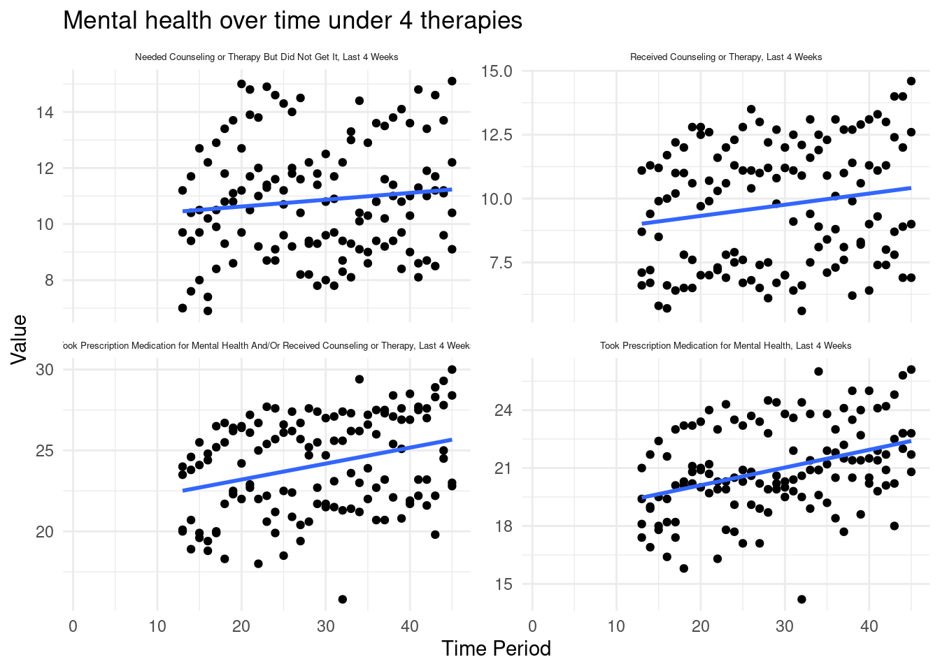 mental_health_clean <- mental_health |>filter(Group =="By Education") |>select(-"Suppression Flag", -"Quartile Range", -"Group", -"State", -"Phase",-"Confidence Interval", -"Time Period Label" )mental_health_clean$"Time Period Start Date"<-mdy(mental_health_clean$"Time Period Start Date")mental_health_clean$"Time Period End Date"<-mdy(mental_health_clean$"Time Period End Date")colnames(mental_health_clean)[colnames(mental_health_clean) =="Subgroup"] <-"Education Level"ggplot(mental_health_clean, aes(x =`Time Period`, y = Value)) +geom_point() +geom_smooth(method ="lm", se =FALSE) +facet_wrap(vars(Indicator), nrow =2, scales ="free_y") +labs(title ="Mental health over time under 4 therapies") +theme_minimal() +theme(strip.text =element_text(size =5))
