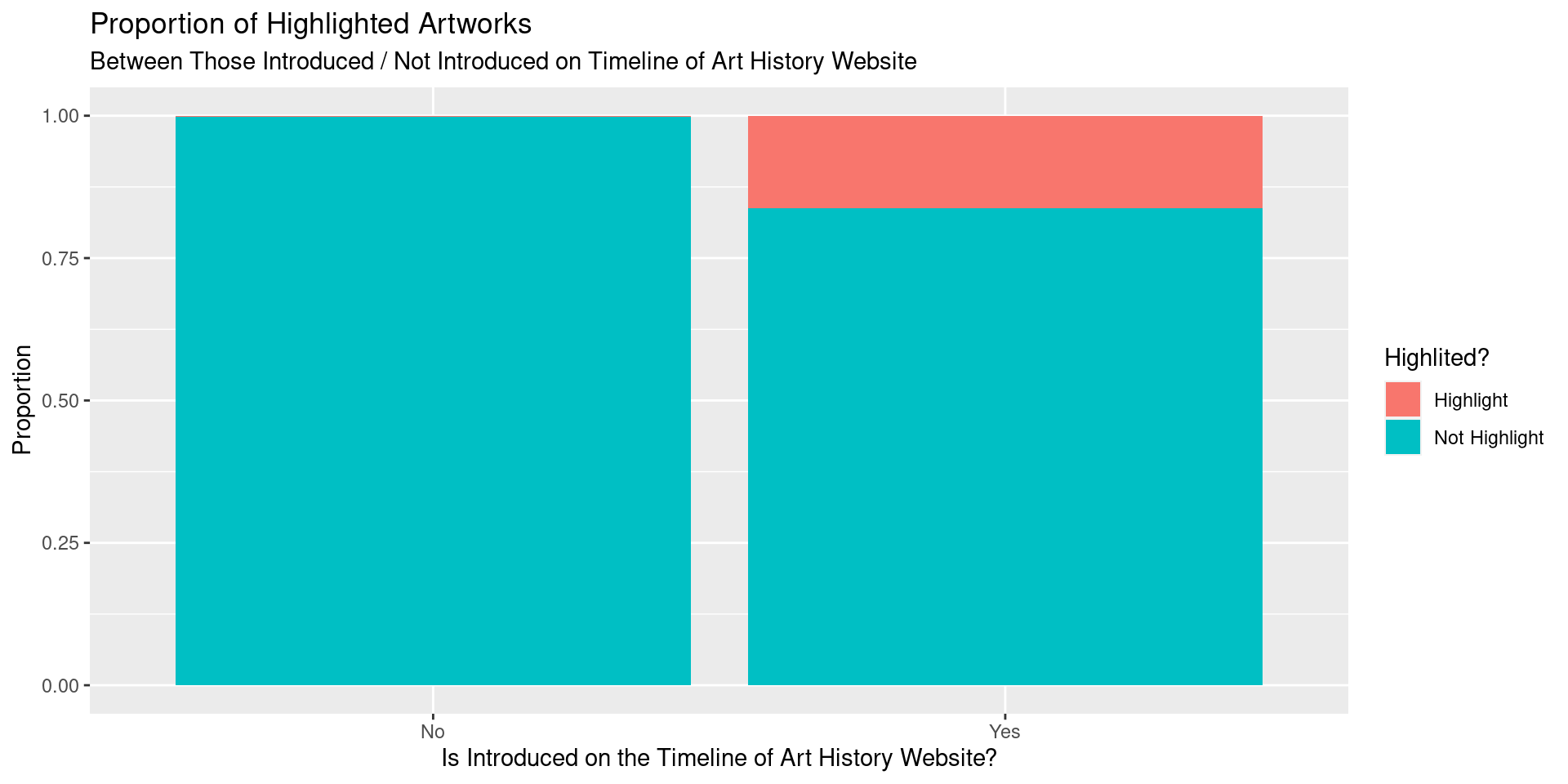 There is sufficient evidence that the proportion of highlighted artworks included on the Timeline of Art History website is higher than the proportion of highlighted artworks not included on the website.