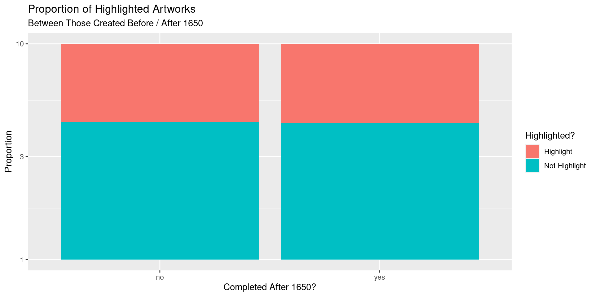 There is sufficient evidence that the proportion of artworks completed before 1650 (pre-Renaissance) that are highlighted is different from the proportion of artworks completed after 1650 (post-Renaissance) that are highlighted.