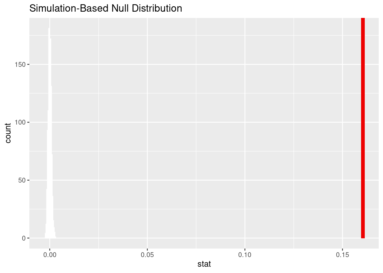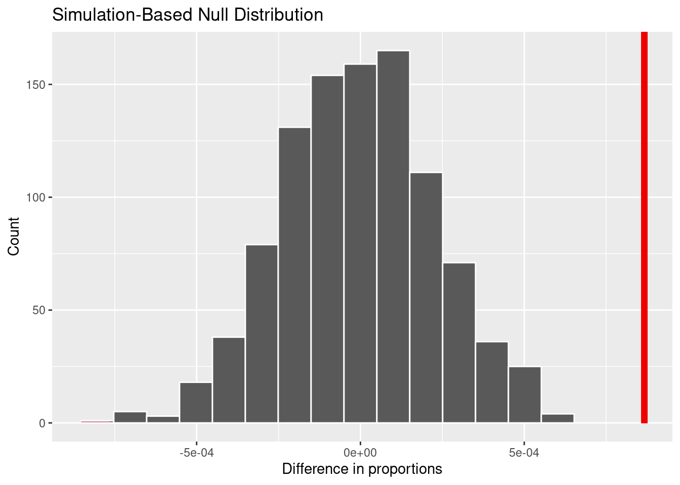 We implemented a bootstrap sampling method with 1000 reps for the analysis. By conducting a hypothesis test for difference in proportions, we obtained a point estimate of 0.1604786 and a null distribution like the graph shown above. Based on the distribution and the point estimate line labeled in red, it is clear that the point estimate (0.1604786) is far from the highest point of the null distribution (~0.005). This indicates that there is little to no probability of a sample producing a higher proportion difference than the point estimate.