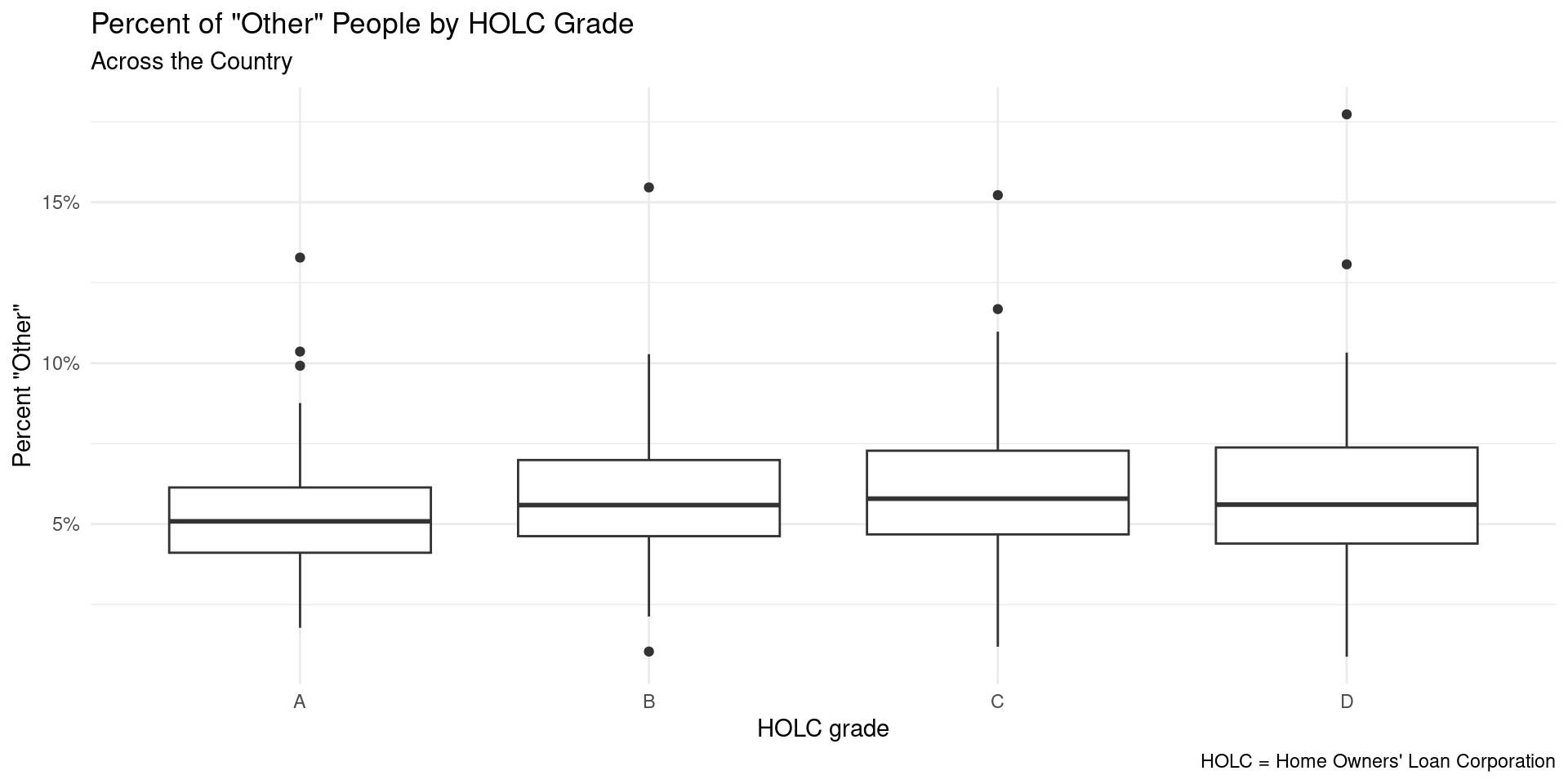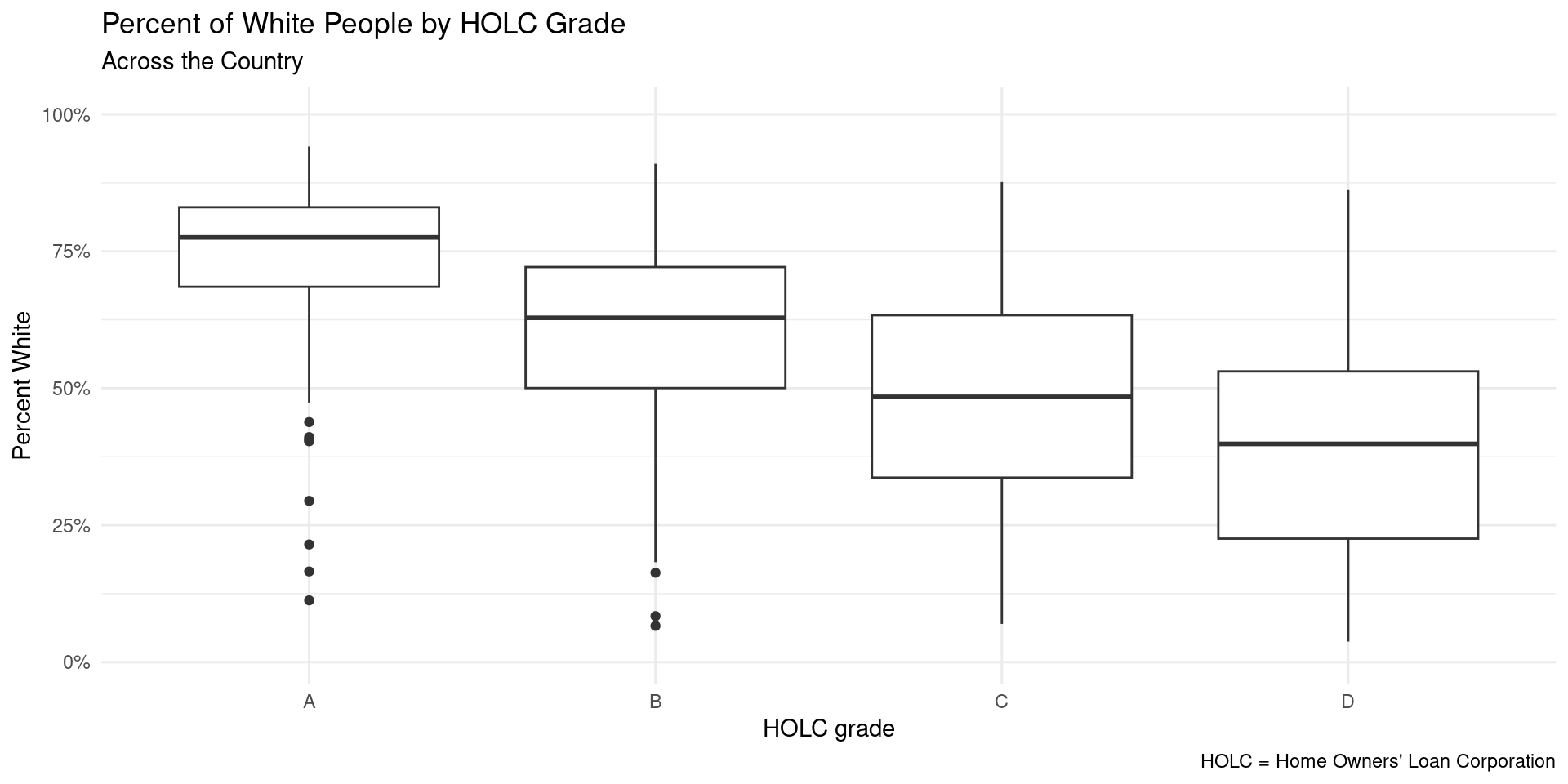The percentage of people who receive each HOLC grade changes depending on the racial group.
