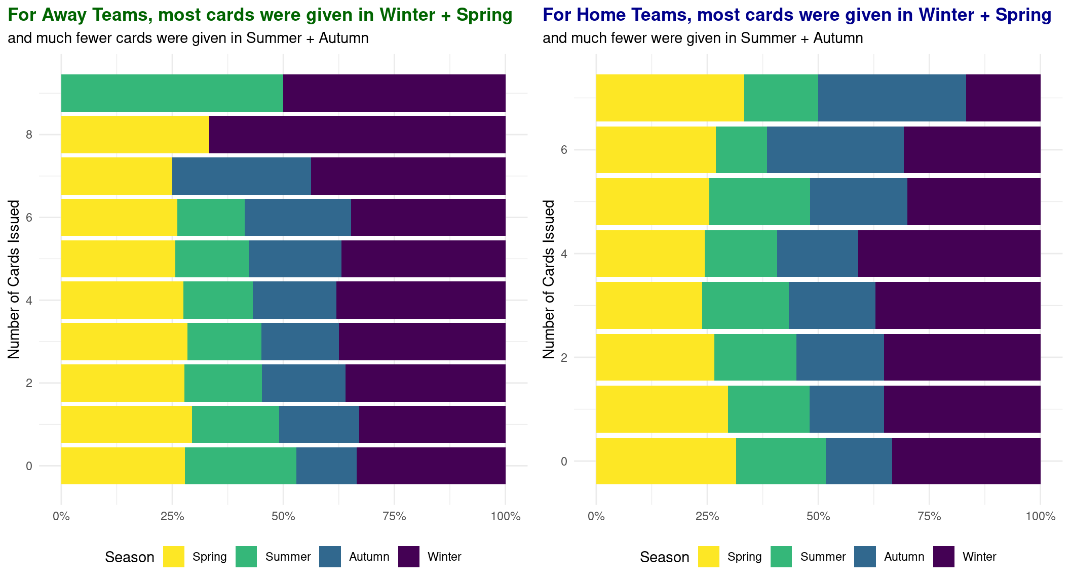 Seasonal period: For both Away and Home Teams, most cards were given in Winter and Spring and much fewer were given in Summer and Autumn