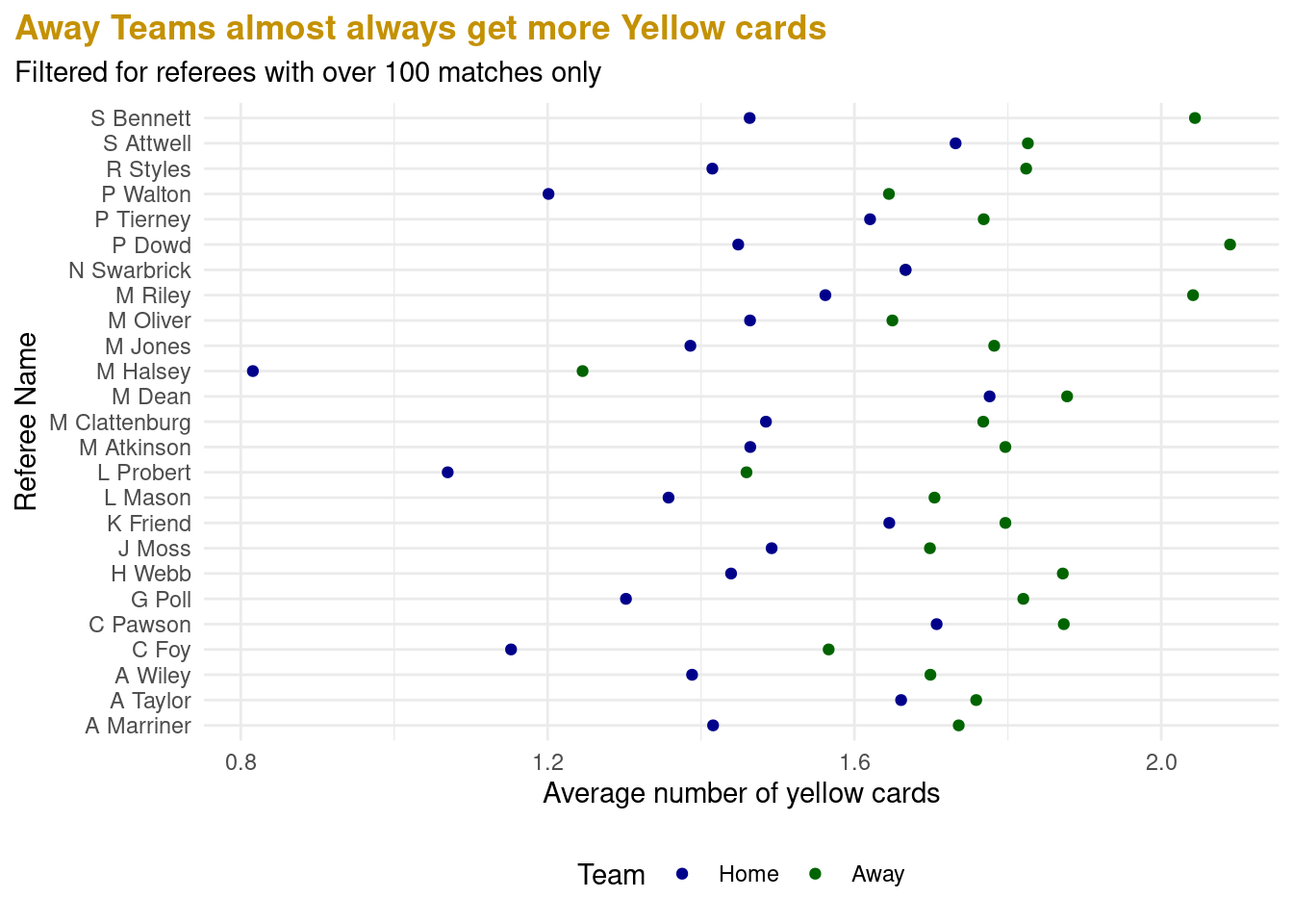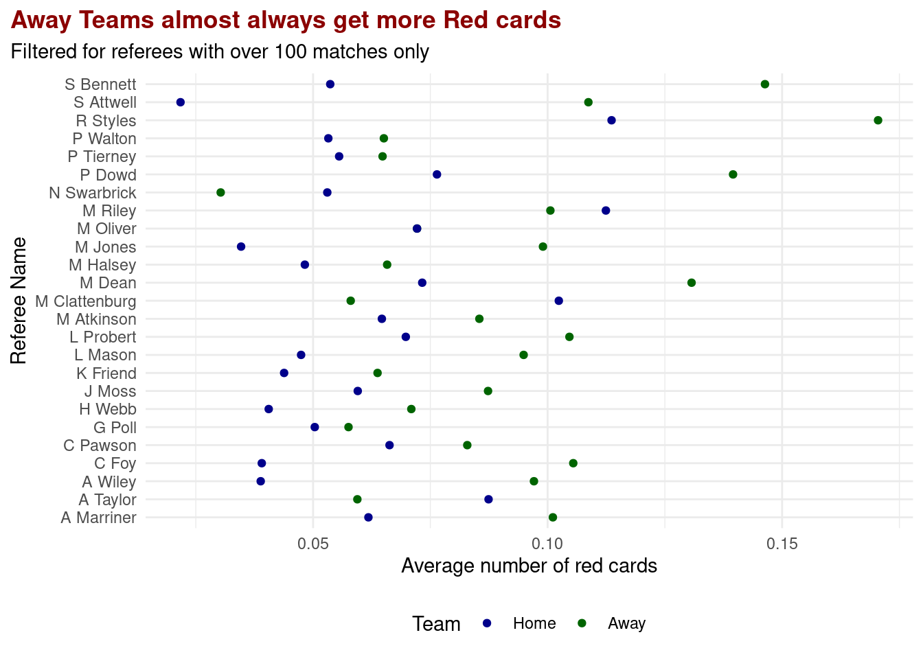 However, when conducting paired t-tests with a 95% confidence interval between the win rates of the team with the specific referee and the team with any other referee for all referees that had officiated at least 10 matches of a certain team, we fail to reject the null hypothesis. In other words, the p-value for all the t-tests conducted was greater than the significance level of 0.05/n (where n is the number of referees for a team), indicating that the difference in individual win rates for a team with a specific referee and all other teams with any other referee is not statistically significant, for all cases of ref and team present in the data. Therefore, we did not identify any referee who has a significant impact on any team’s win rate.