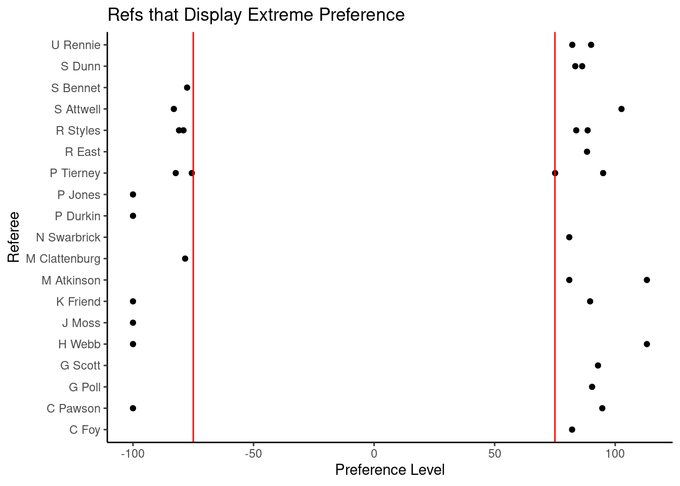 As seen in the graph Refs That Display Extreme Preference, calculated as absolute value of extreme preference (pref_level = cl_ref_win_rate / cl_win_rate * 100 - 100) greather than or equal to 75, there is some suggestion that there may potentially be ref bias in the EPL.