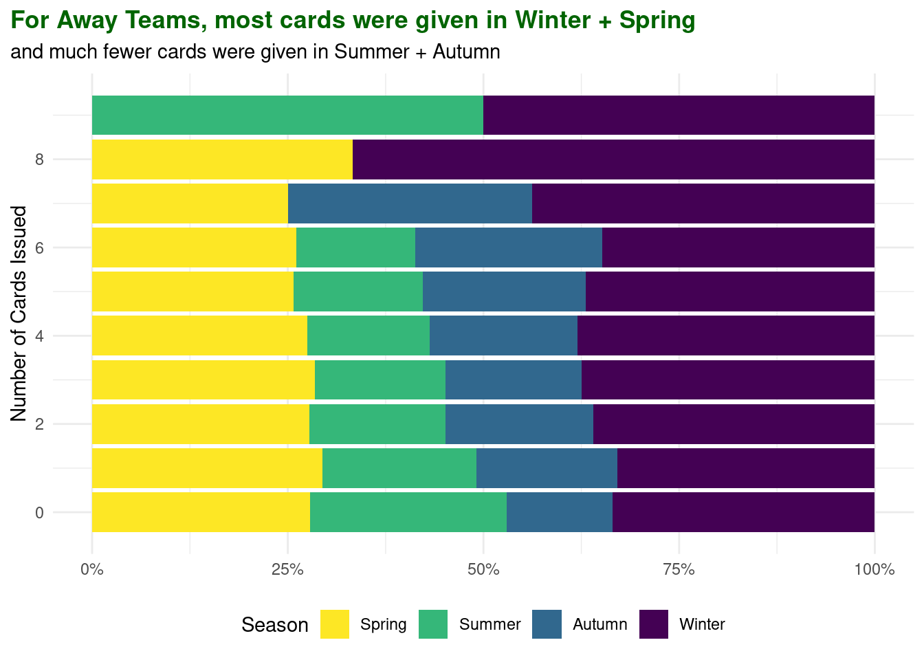 For away teams, on average, the referee issues approximately 2 cards during winter.