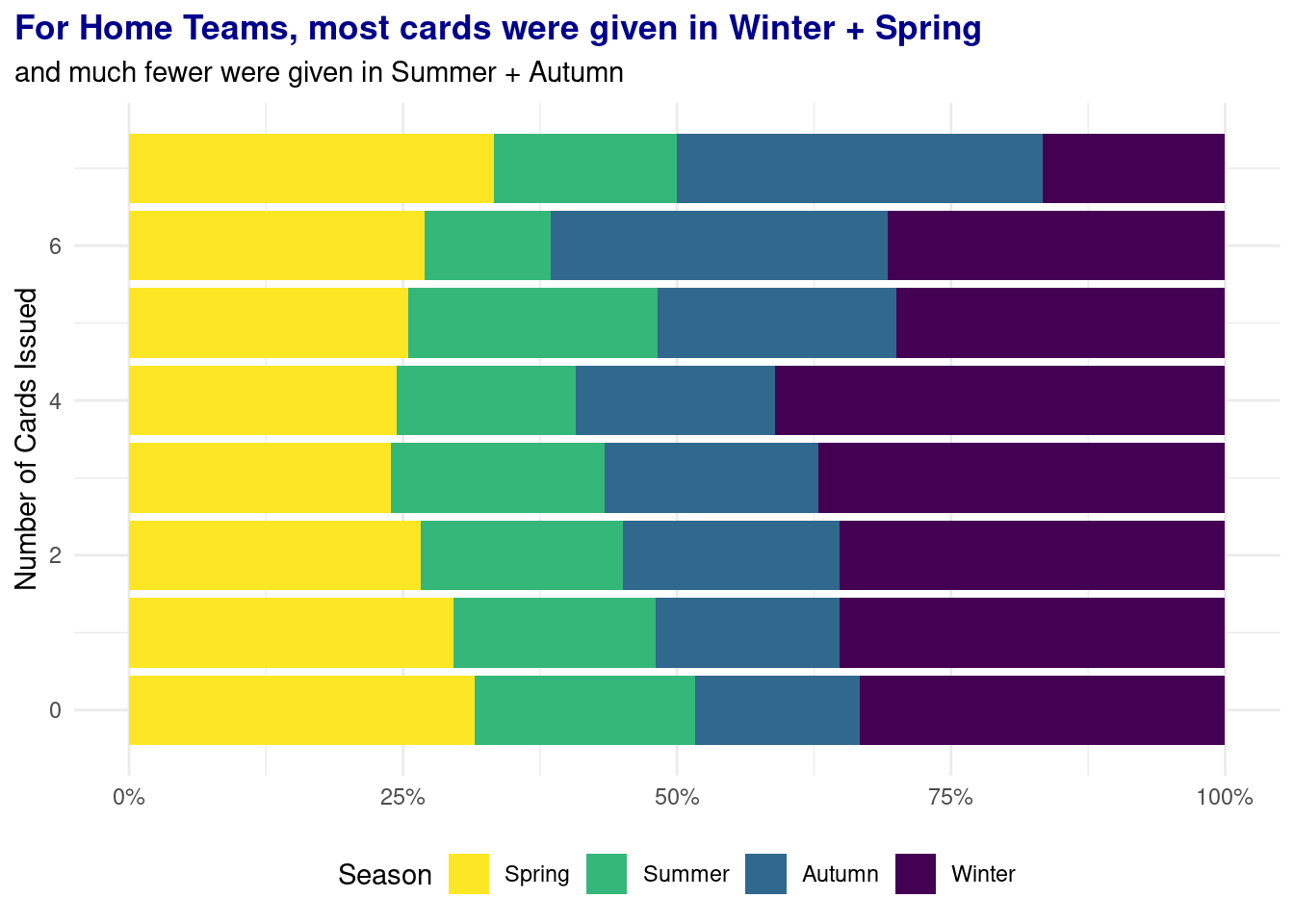 For home teams, on average, the referee issues approximately 2 cards during winter.