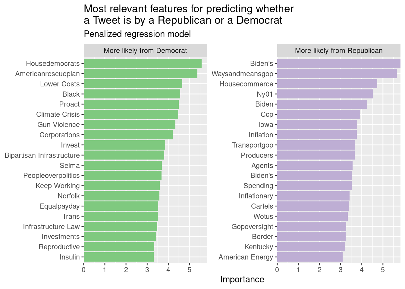 glmnet_best <-readRDS("trained_glmnet_model.rds")glmnet_tune <-readRDS("glmnet_tune.rds")# the error occurs below \/glmnet_imp <- glmnet_best |>extract_fit_parsnip() |>vi(method ="model", lambda =select_best(x = glmnet_tune, metric ="roc_auc")$penalty)#the error occurs above /\glmnet_imp |>mutate(Variable =str_replace(Variable, "tfidf_full_text_", ""),Variable =str_to_title(str_replace_all(Variable, "_", " ")),Sign =case_when( Sign =="NEG"~"More likely from Democrat", Sign =="POS"~"More likely from Republican" ),Importance =abs(Importance))|>group_by(Sign) |>slice_max(order_by = Importance, n =20) |>ggplot(mapping =aes(x = Importance,y =fct_reorder(Variable, Importance),fill = Sign )) +geom_col(show.legend =FALSE) +scale_x_continuous(expand =c(0, 0)) +scale_fill_brewer(type ="qual") +facet_wrap(facets =vars(Sign), scales ="free_y") +labs(y =NULL,title ="Most relevant features for predicting whether\na Tweet is by a Republican or a Democrat",subtitle ="Penalized regression model" )