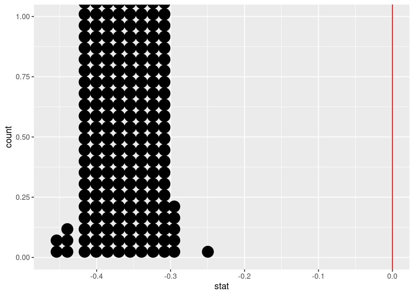 ggplot(boot_df, aes(x = stat)) +geom_dotplot() +geom_vline(xintercept =0, color ="red")