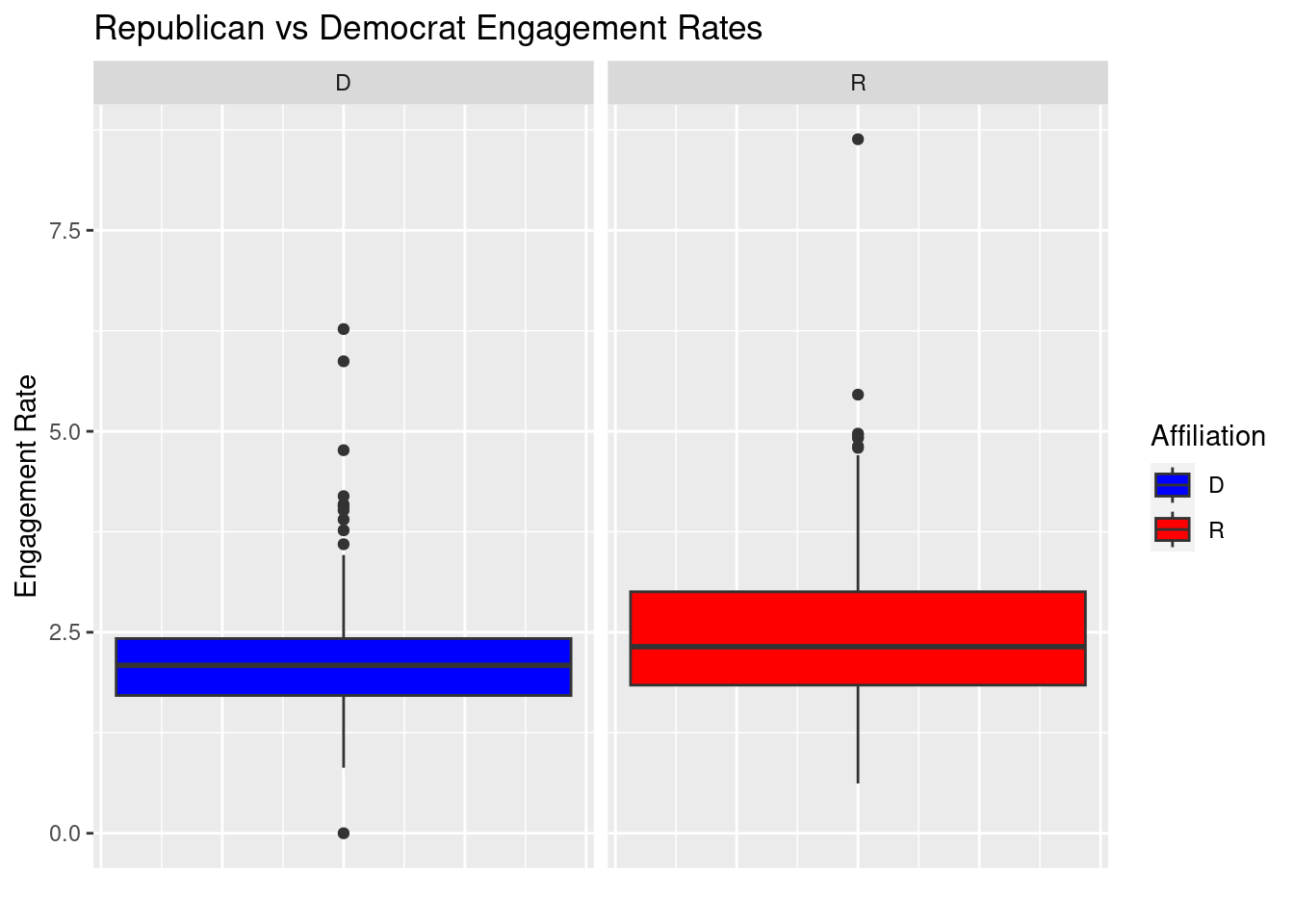 To begin, let’s plot the relationship between the number of followers and political affiliation to see whether Democrats or Republicans have more “clout” on Twitter.