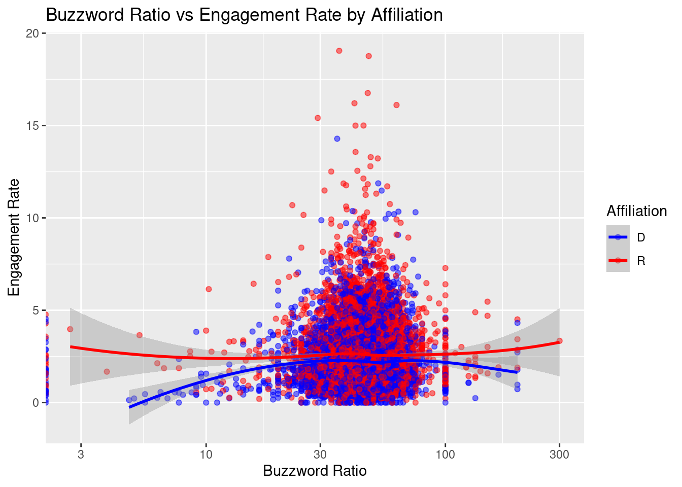Buzzword Ratio vs Engagement After calculating engagement rate, we also developed a new column called buzz_ratio, computed by dividing the number of buzzwords in a tweet by the total number of words in a tweet. This gives us the proportion of buzzwords within a tweet, which we can use to compare against engagement rate. This controls for relative content size across tweets to compare against engagement rates of viewers. We visualized the relationship with a scatterplot to understand the correlation between the two variables and fit a model taking interaction effects into account as well. Upon visual analysis of the scatterplot, we noticed that republicans tend to have slightly higher engagement rates than democrats for an equivalent buzzword ratio, particularly at the tail ends of the buzzword ratio (based on our application of a loess method line of best fit. There is not a strong correlation between these two variables, though we have noticed that there appears to be a stronger engagement rate on the high-end for buzzword ratio values between 20 and 70, approximately. This range also seems to be where the posts with the highest engagement lie, indicating that this could be a goldilocks zone for the ratio of buzzwords that congress members should use to achieve higher engagement rates from their viewers.