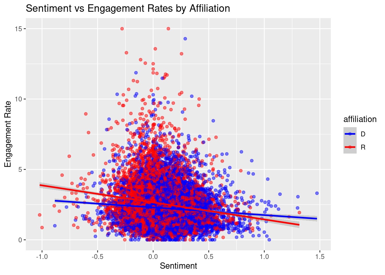 By plotting these lines, we can see that there seems to be an inverted relationship between the sentiment and the engagement rate of the Tweet, and it’s more dramatic for Republican Representatives. It looks as though when the sentiment goes down, the engagement rate increases.