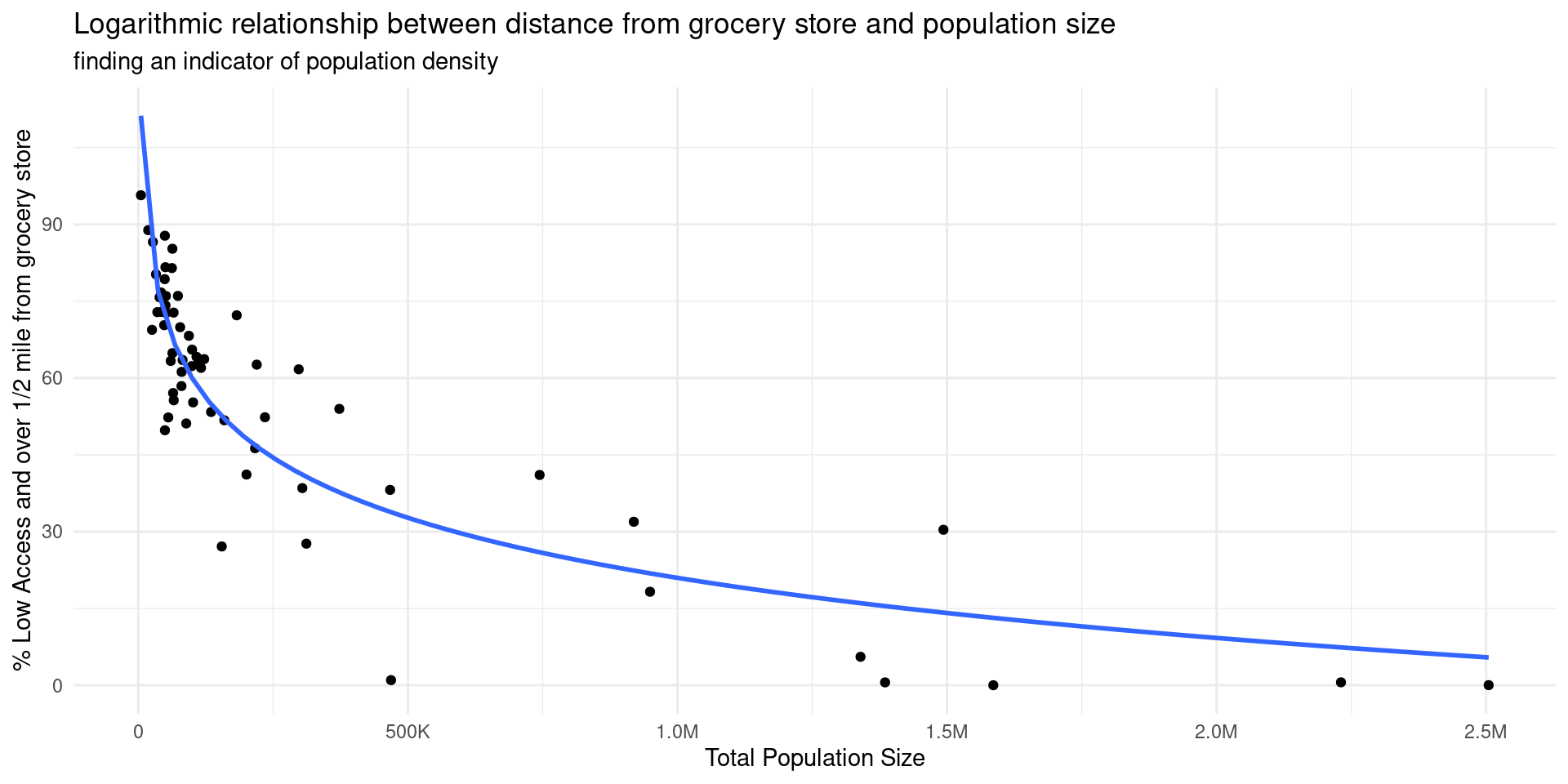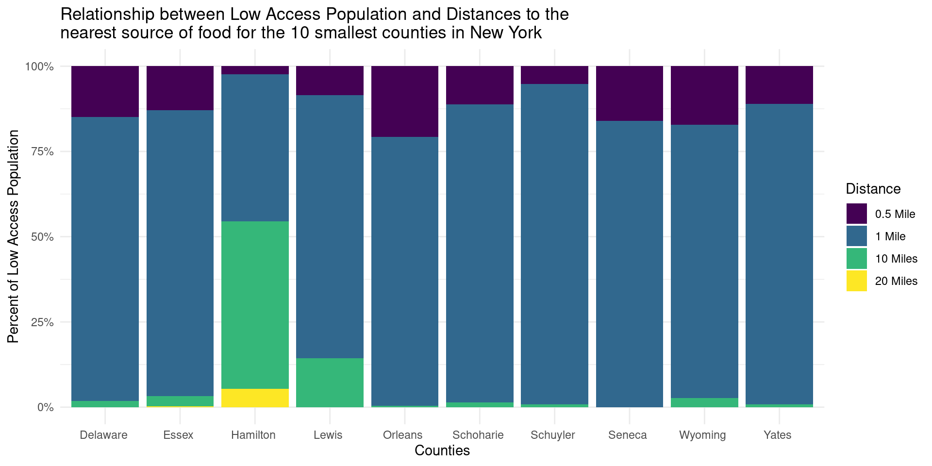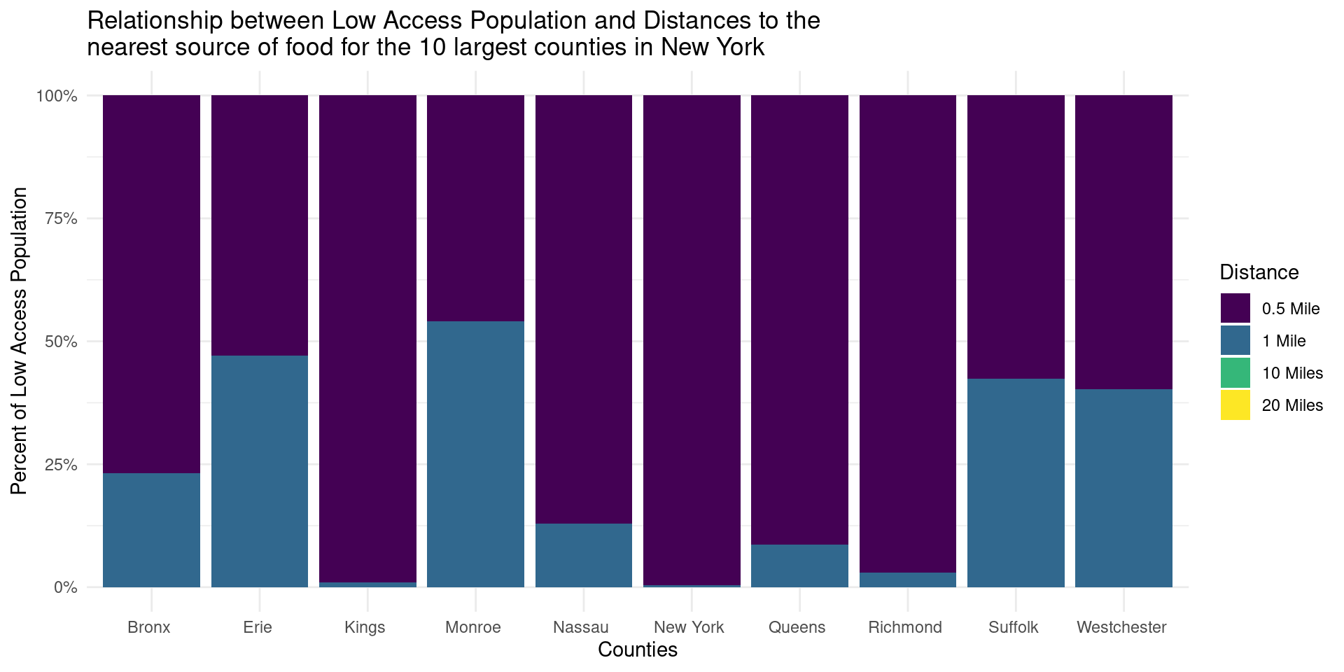 Null: There is no difference in the relationship between low access population and distances to the nearest source of food between the 10 largest and 10 smallest counties in New York.