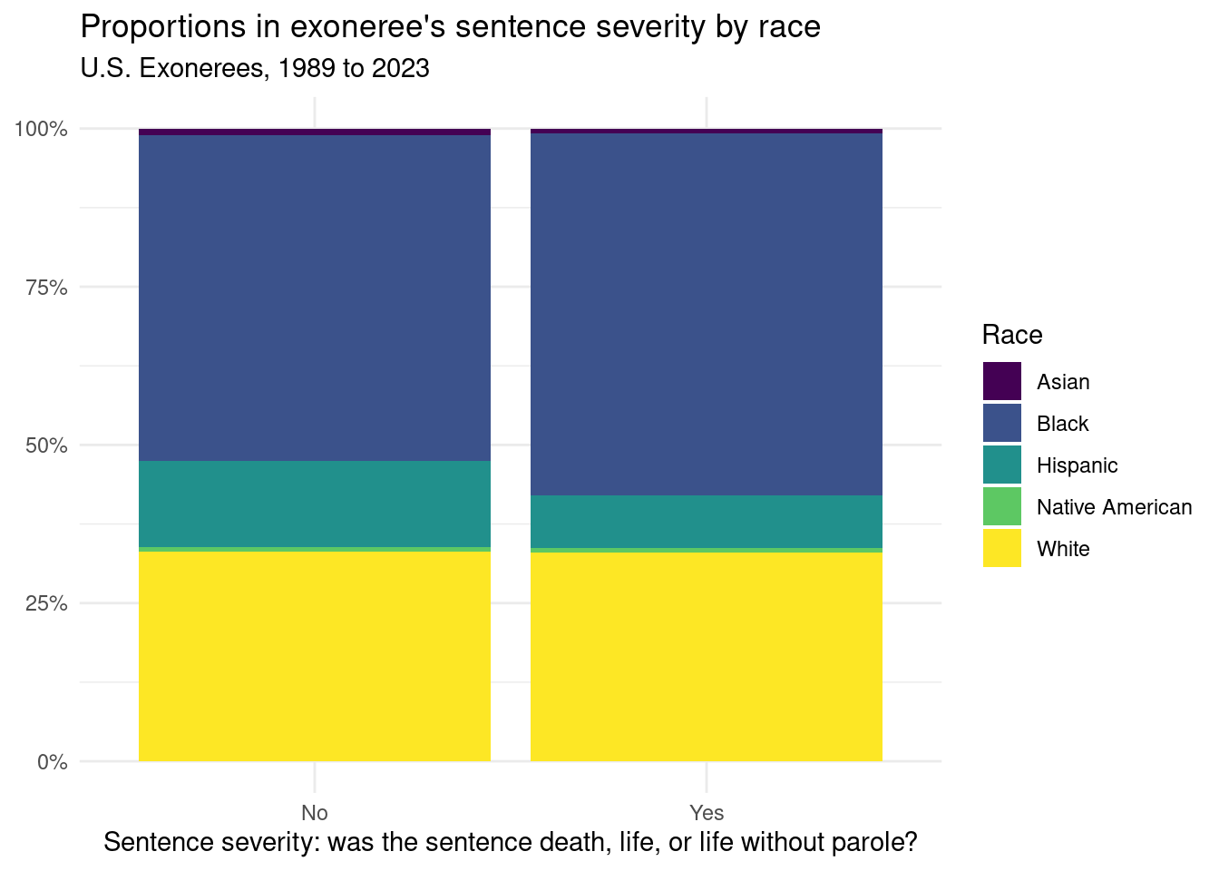 us_exonerations |>filter(race %in% race_5) |>ggplot(aes(x = sentence_severity, fill = race)) +geom_bar(position ="fill") +scale_fill_viridis_d() +scale_y_continuous(labels = scales::percent) +labs(title ="Proportions in exoneree's sentence severity by race",subtitle ="U.S. Exonerees, 1989 to 2023",x ="Sentence severity: was the sentence death, life, or life without parole?",y =NULL,fill ="Race" ) +theme_minimal()