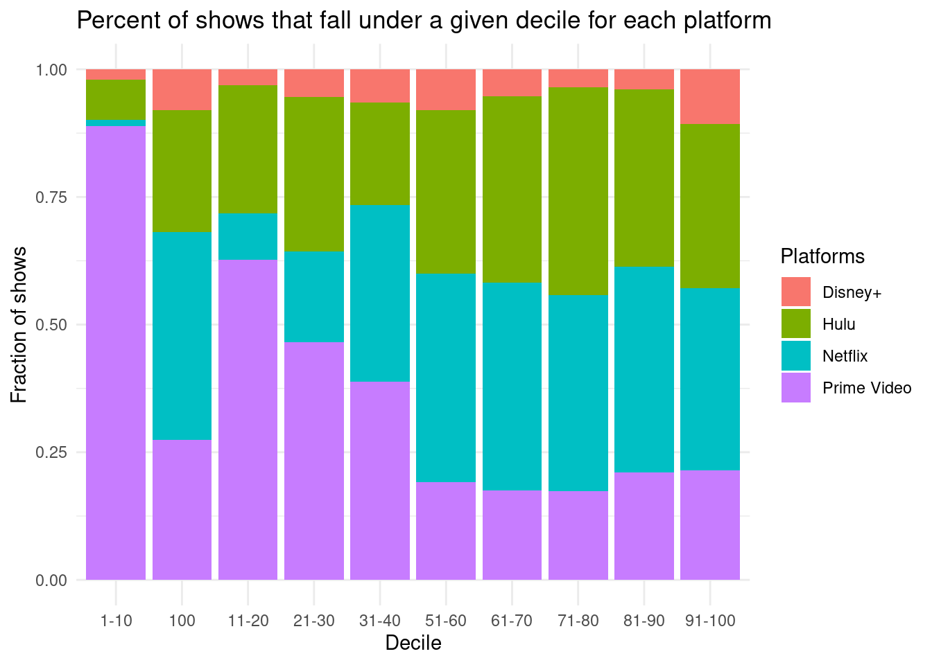 mean_rankings <-data.frame(platform =c('Netflix','Hulu','Amazon Prime','Disney'),mean=c(netflix[[3]][1], hulu[[3]][1], prime[[3]][1], disney[[3]][1]))total_per_platform |>ggplot(aes(x = decile, y = number, fill = platform)) +geom_bar(position ="fill", stat ="identity") +scale_color_viridis_d(option ="D", end =0.8) +theme_minimal() +labs(title ="Percent of shows that fall under a given decile for each platform",x ="Decile", y ="Fraction of shows", fill ="Platforms", disnay ="Disney+") +scale_fill_discrete(labels =c("Disney+", "Hulu","Netflix", "Prime Video"))