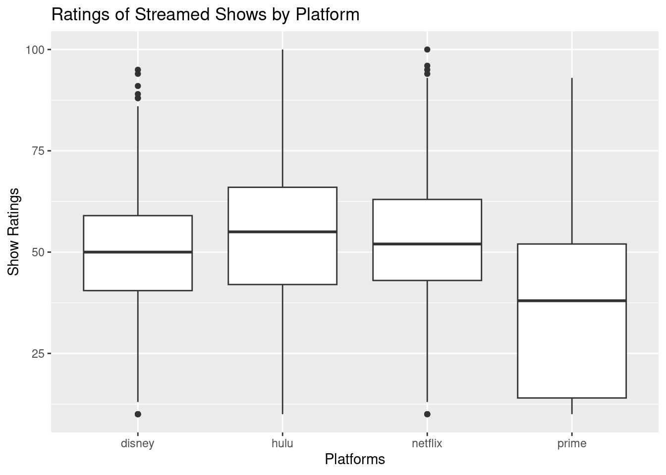 total |>ggplot(aes(x = platform, y = rotten_tomatoes)) +geom_boxplot() +labs(title ="Ratings of Streamed Shows by Platform", x ="Platforms", y ="Show Ratings")