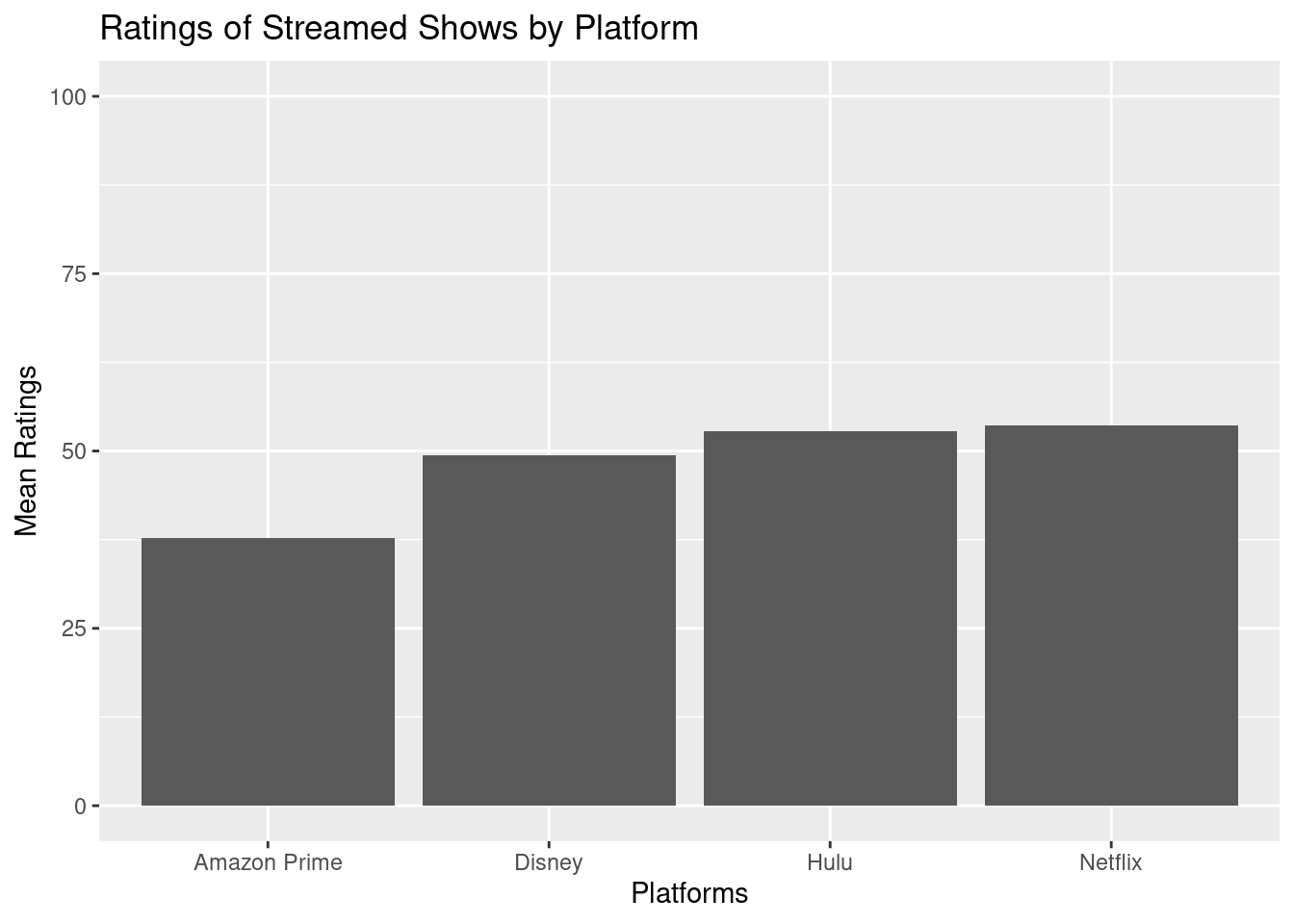 mean_rankings |>ggplot(aes(x = platform, y = mean)) +ylim(c(0, 100)) +geom_bar(stat ="identity") +labs(title ="Ratings of Streamed Shows by Platform",x ="Platforms", y ="Mean Ratings")
