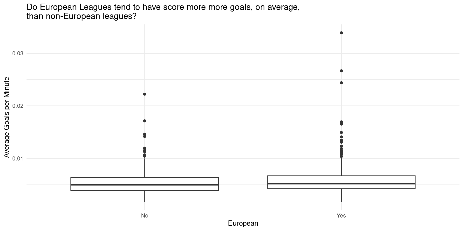 Average goals per minute (a proxy for aggressiveness) does not differ between European and non-European leagues.
