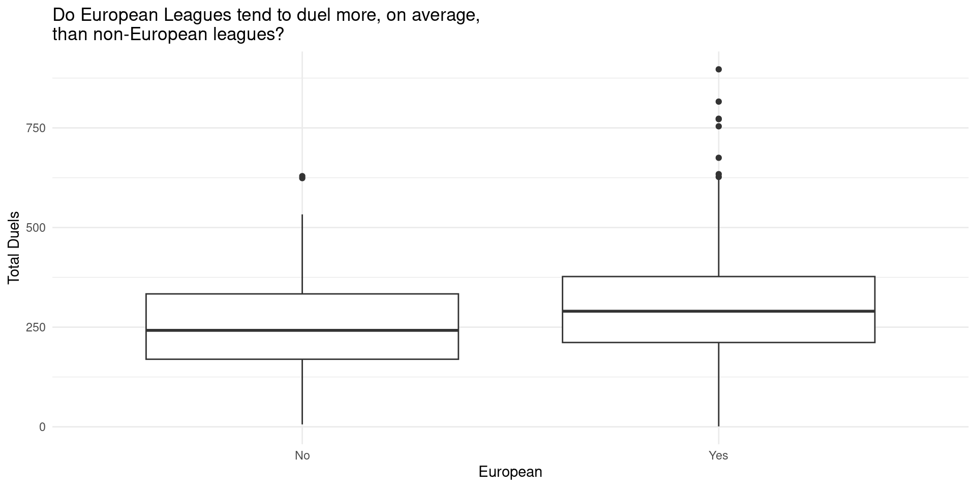 Total number of duels (a proxy for aggressiveness) differs between European and non-European leagues.