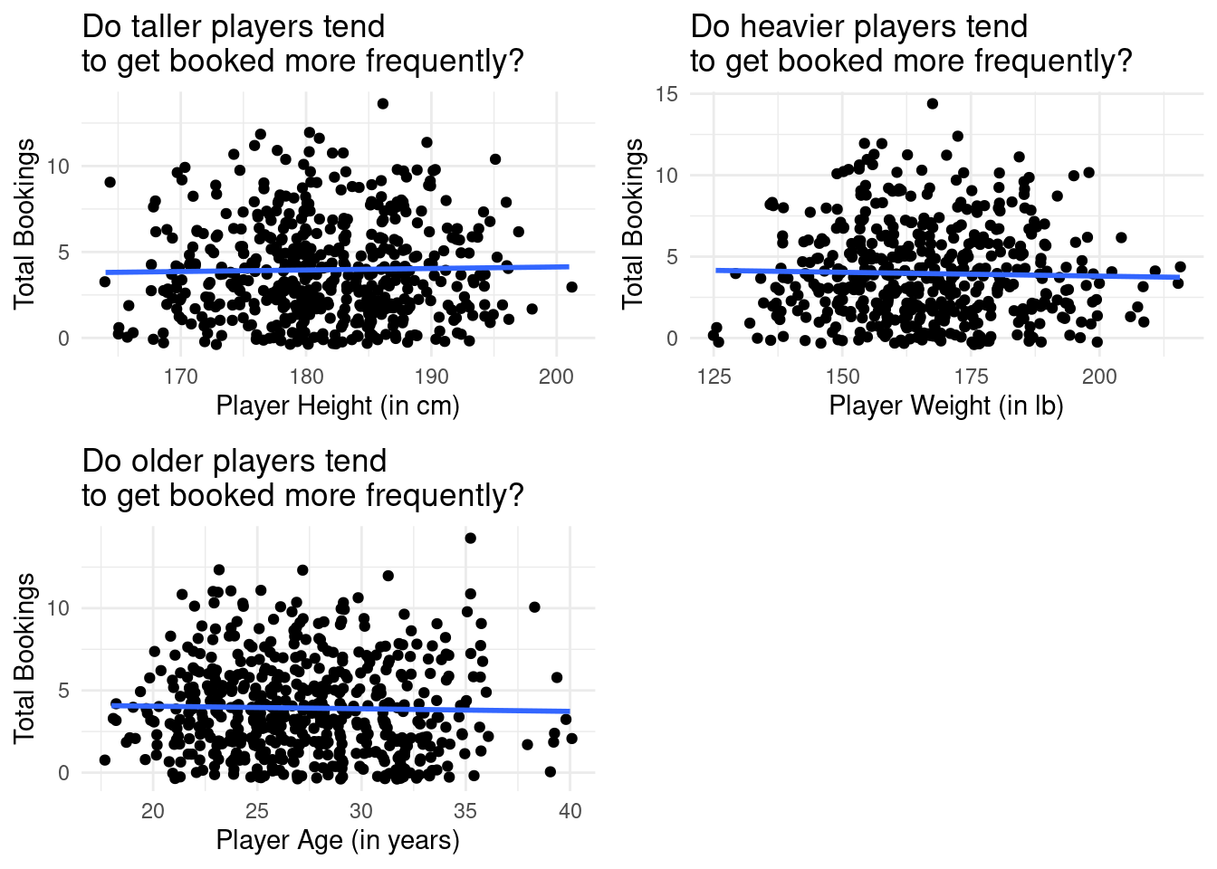 The motivation behind this project was to determine whether or not there were relationships between soccer players, leagues, and their respective statistics. Each observation represents a player, and columns represent descriptors such as height, weight, nationality, passes, goals scored, assists, penalties, etc. Since soccer is such a popular global sport, we aimed to answer the following research questions in our project: 1) What factors influence booking frequency of players? and 2) Does aggressiveness differ between European and non-European leagues? For question 1, some factors that were considered were player height, weight, age, and player rating. For question 2, aggressiveness was indirectly measured through average penalties per game, average goals per minute, average shots per game, and total duels.