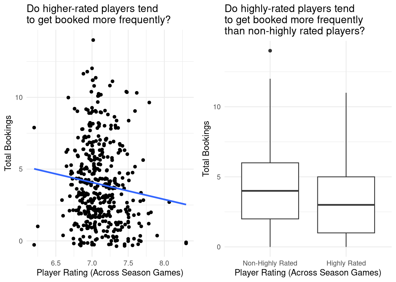 Based on our EDA, there appeared as though non-highly ranked players were booked more than highly ranked players, where highly ranked players were rated greater than or equal to the mean player rating, and non-highly ranked players were rated less than the mean player rating.