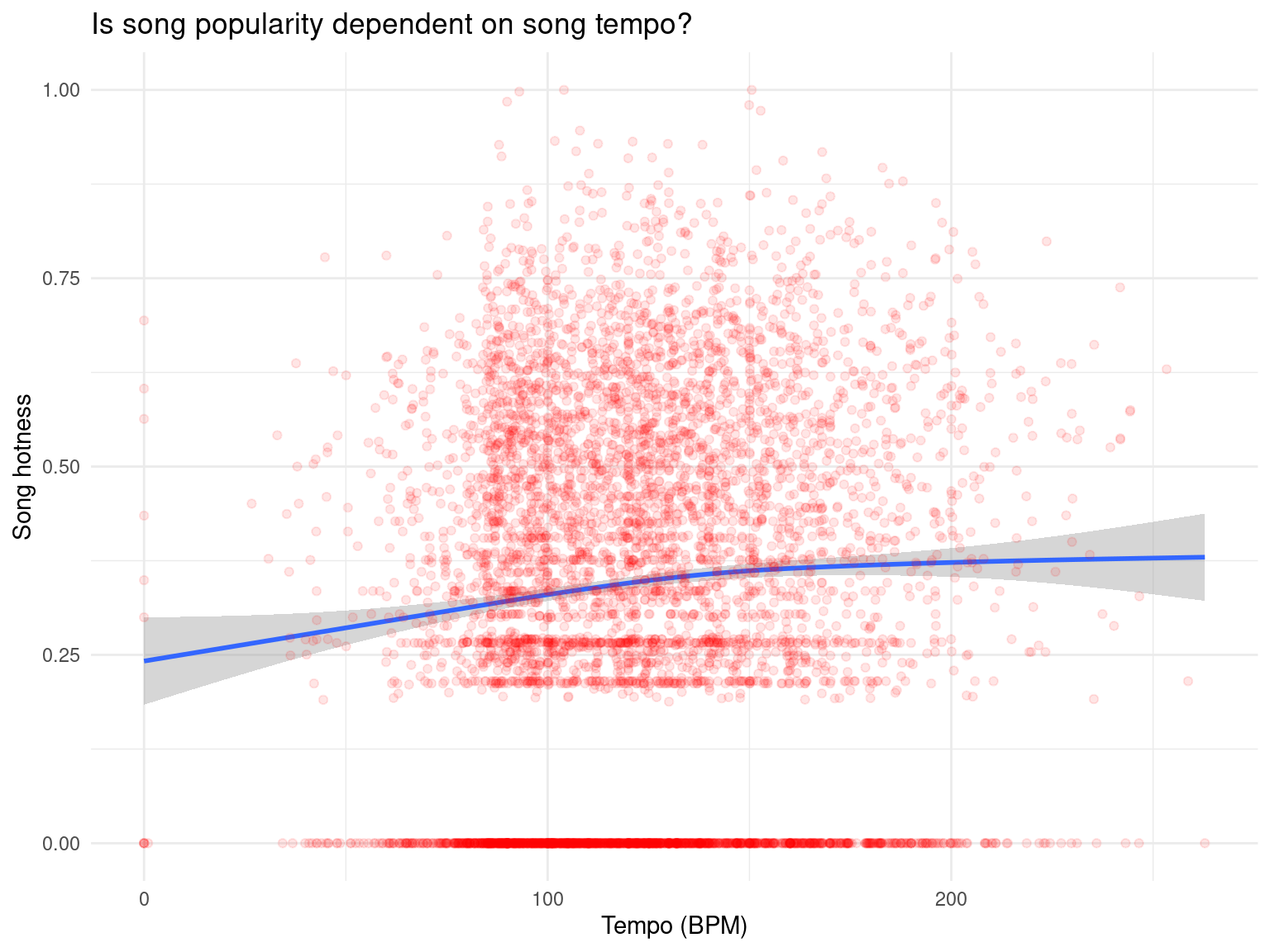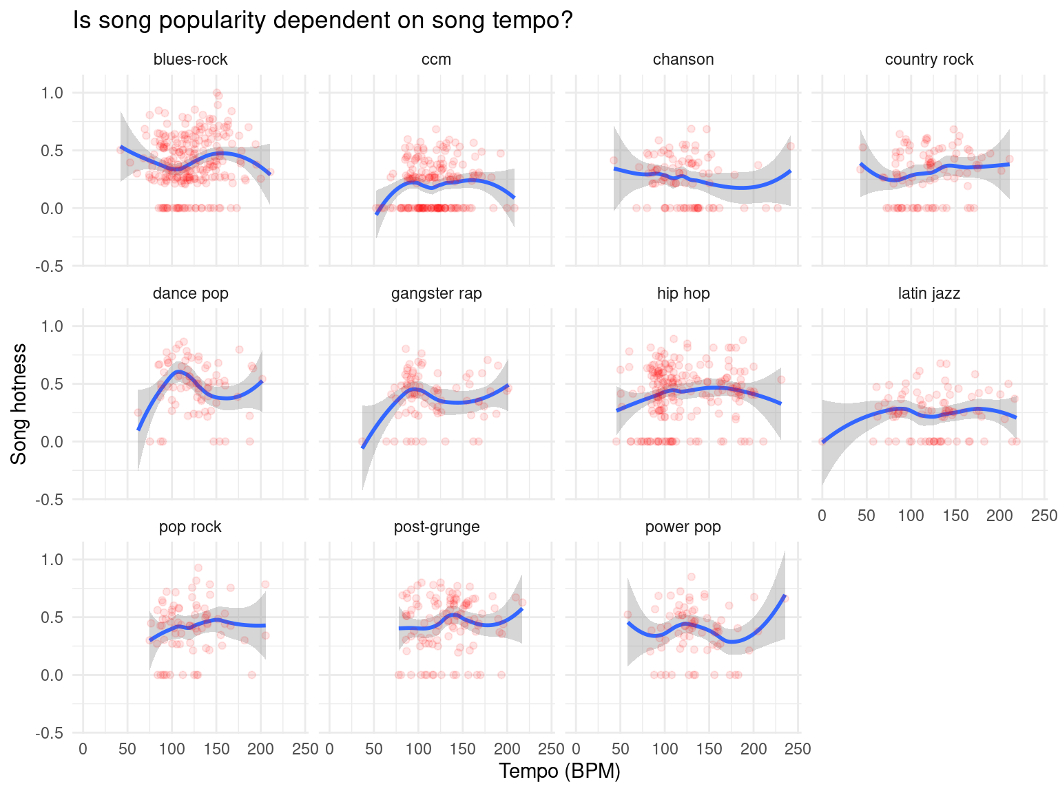 There was very little correlation between song tempo and song popularity, but we noticed a lot of variation when grouping by song genre.