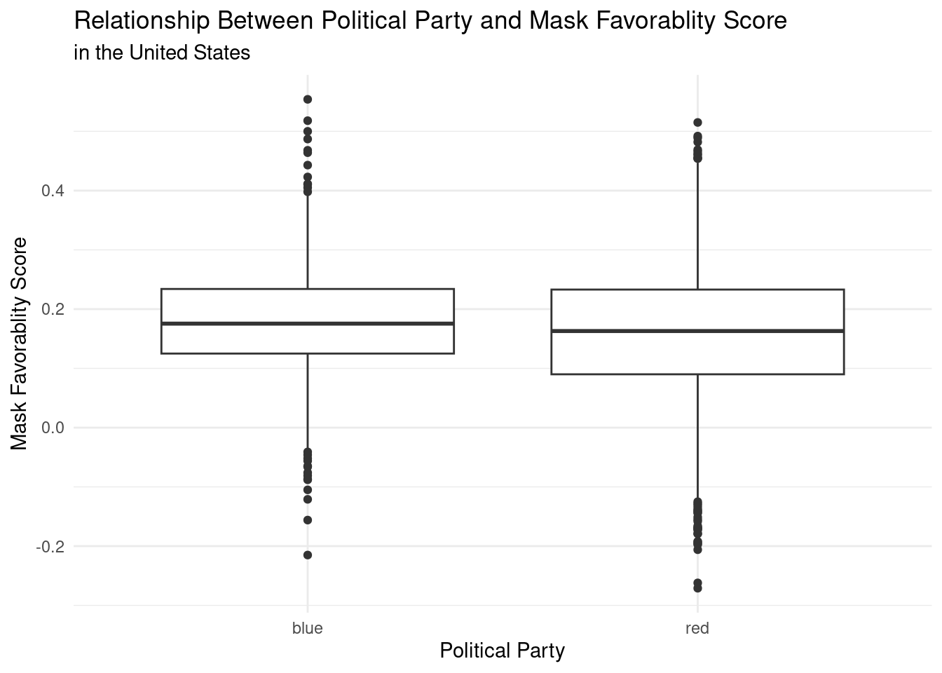 election_data|>ggplot(aes(x =`State Color`, y = Score))+geom_boxplot() +labs (title ="Relationship Between Political Party and Mask Favorablity Score",subtitle ="in the United States",x ="Political Party",y ="Mask Favorablity Score" ) +theme_minimal()