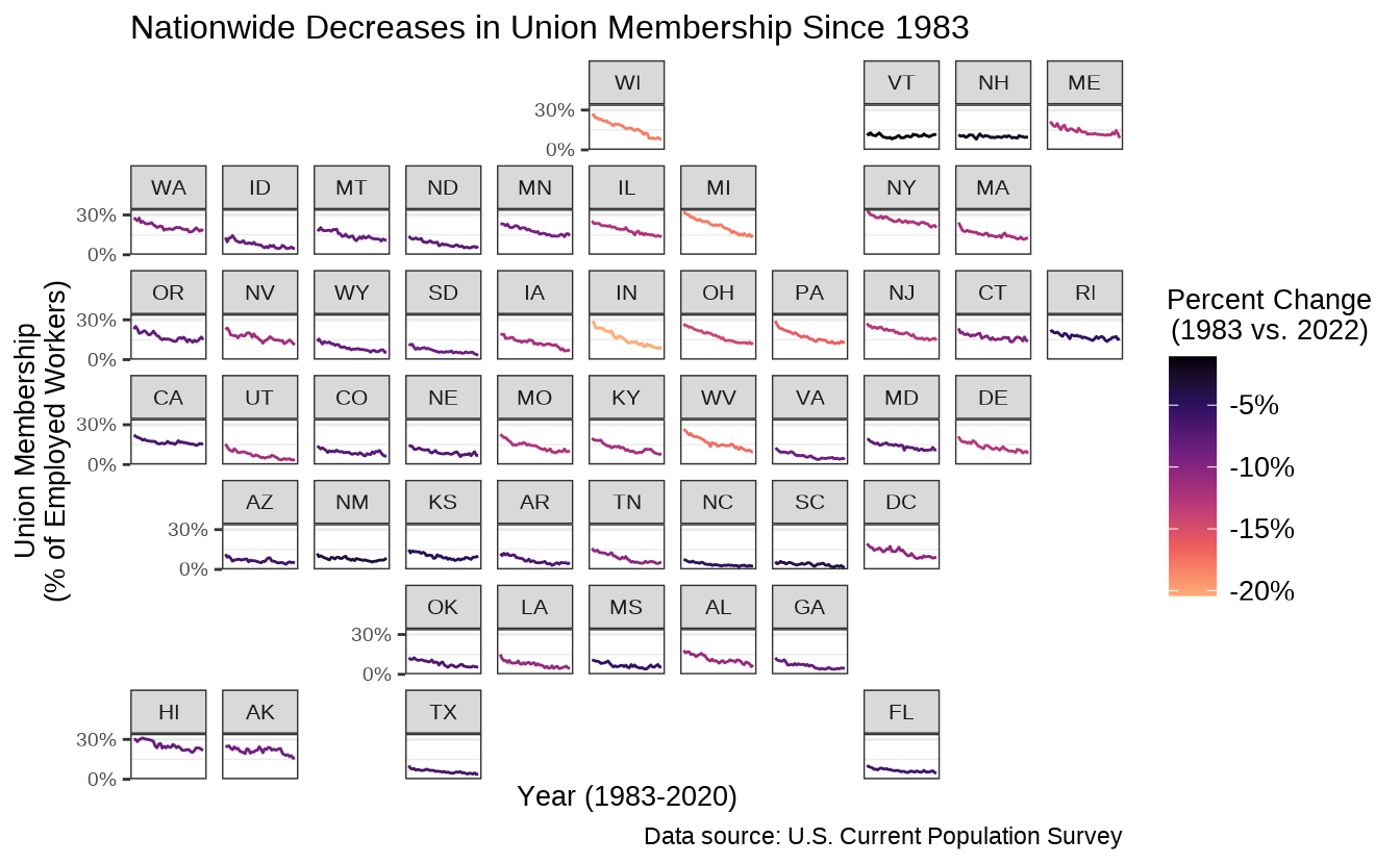 We worked with the Union Membership in the United States dataset, originally derived from work by Barry Hirsch (Georgia State University), David Macpherson (Trinity University), and William Even (Miami University).
