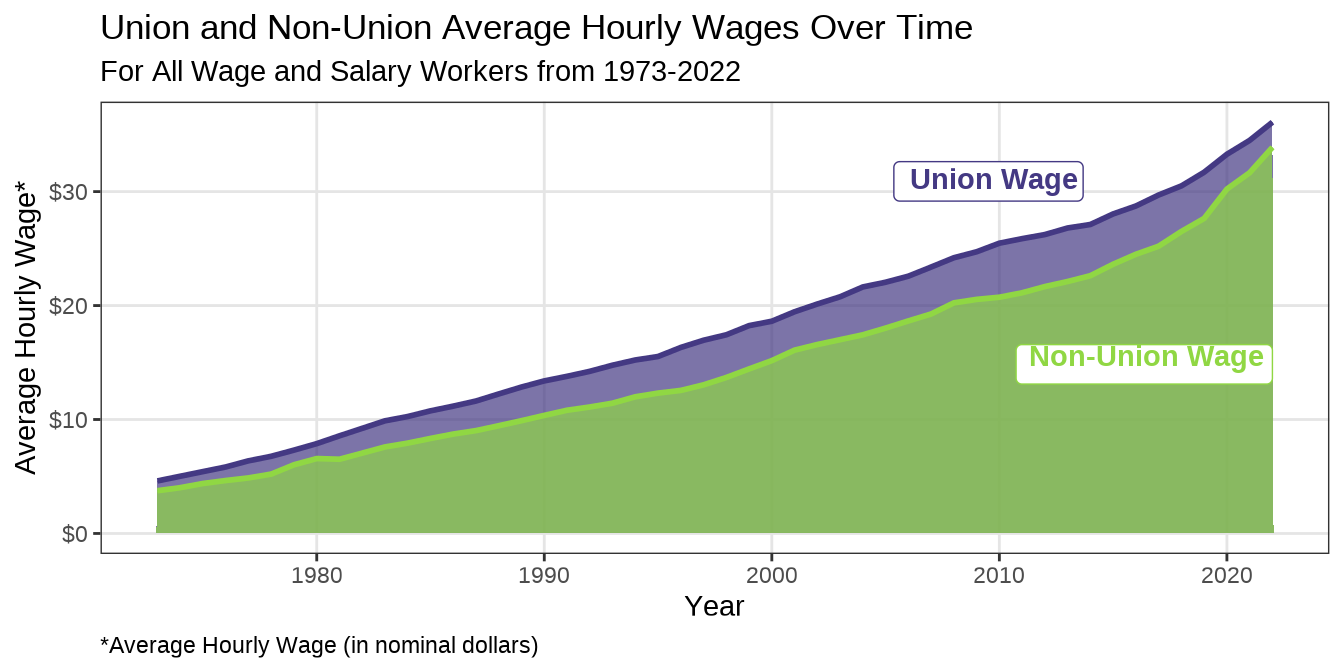 Similar rates of increase, but differences in gaps between union and non-union wages