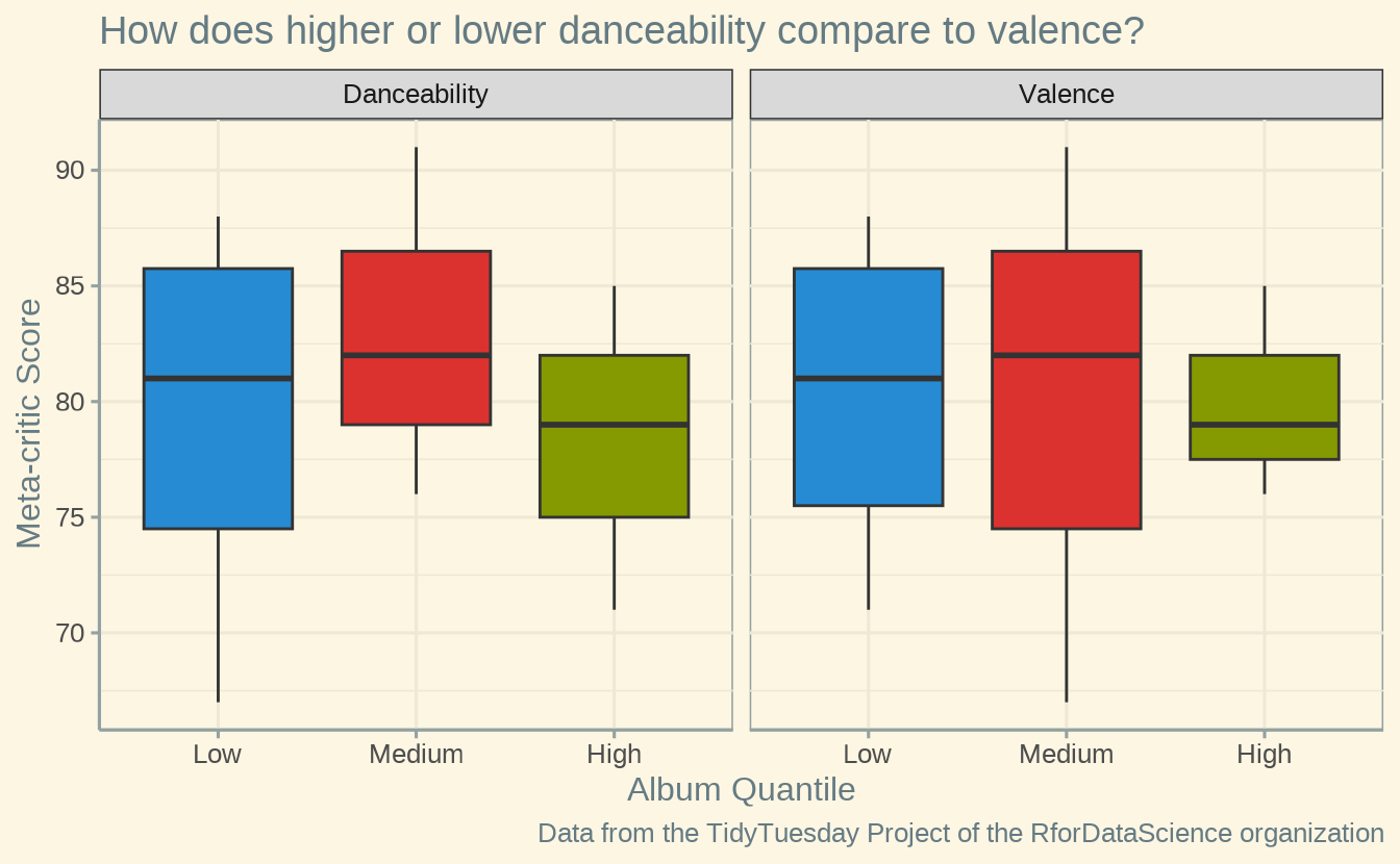 - Boxplot shows level of danceability and valence do not have much of an effect on the meta-critic score of album.