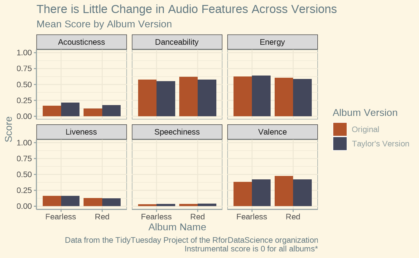 - Bar plot shows that there were slight increases in acousticness and speechiness but a small decrease in danceability on Taylor’s Versions
