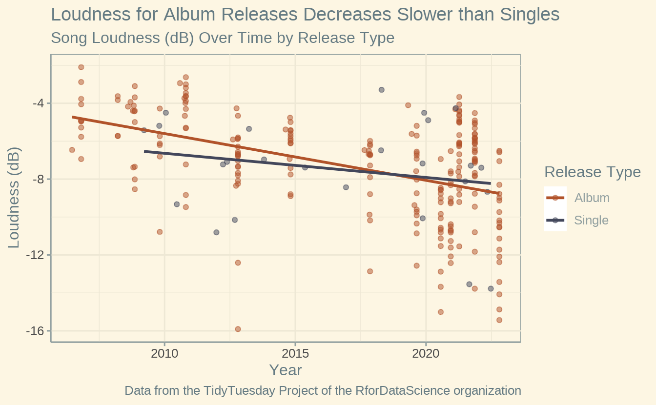 - Scatterplot reveals a decrease in loudness over the years