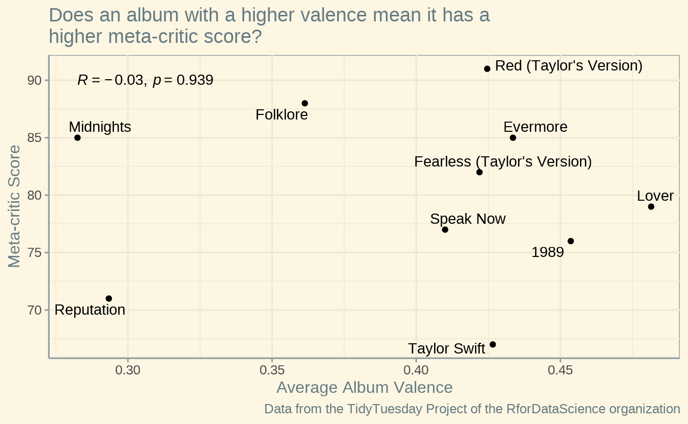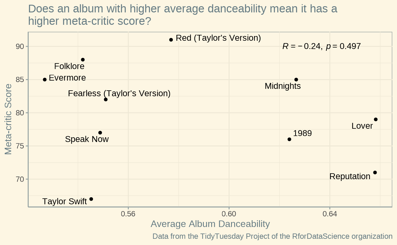 Taylor Swift data from the TidyTuesday project (RforDataScience on GitHub).