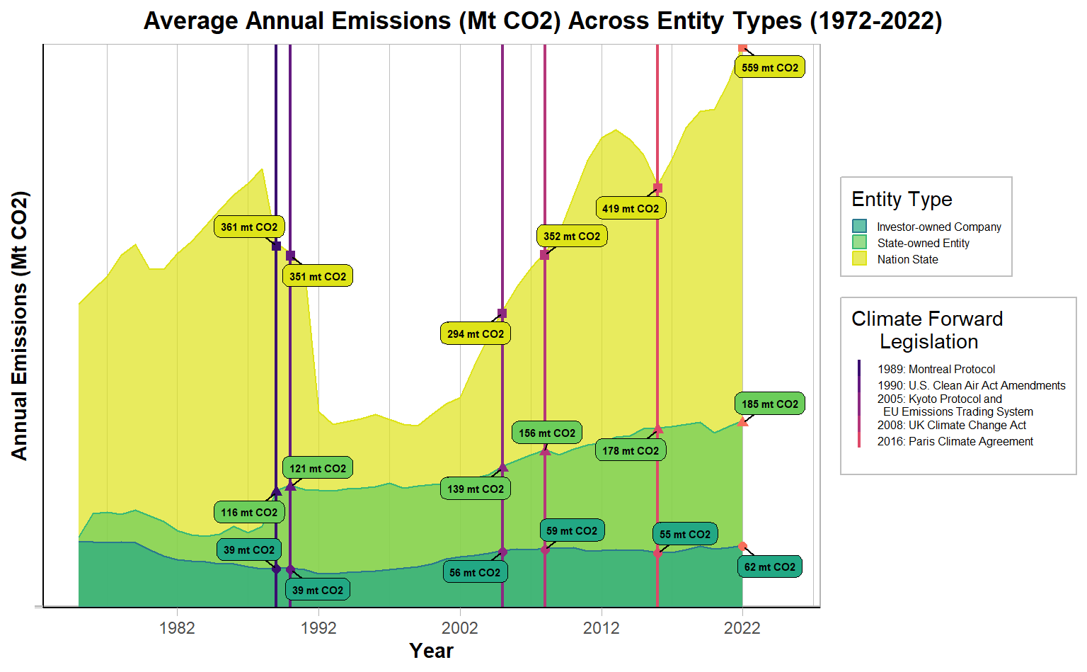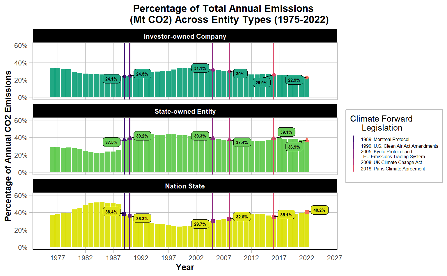 Do different entity types have different emission patterns over time, and are pattern changes related to enacted major climate conscious legislation?