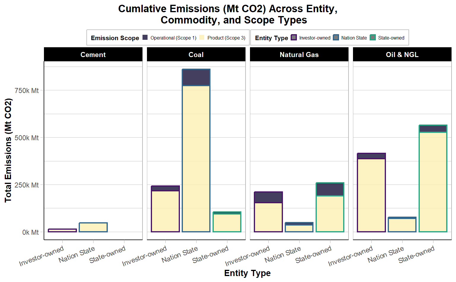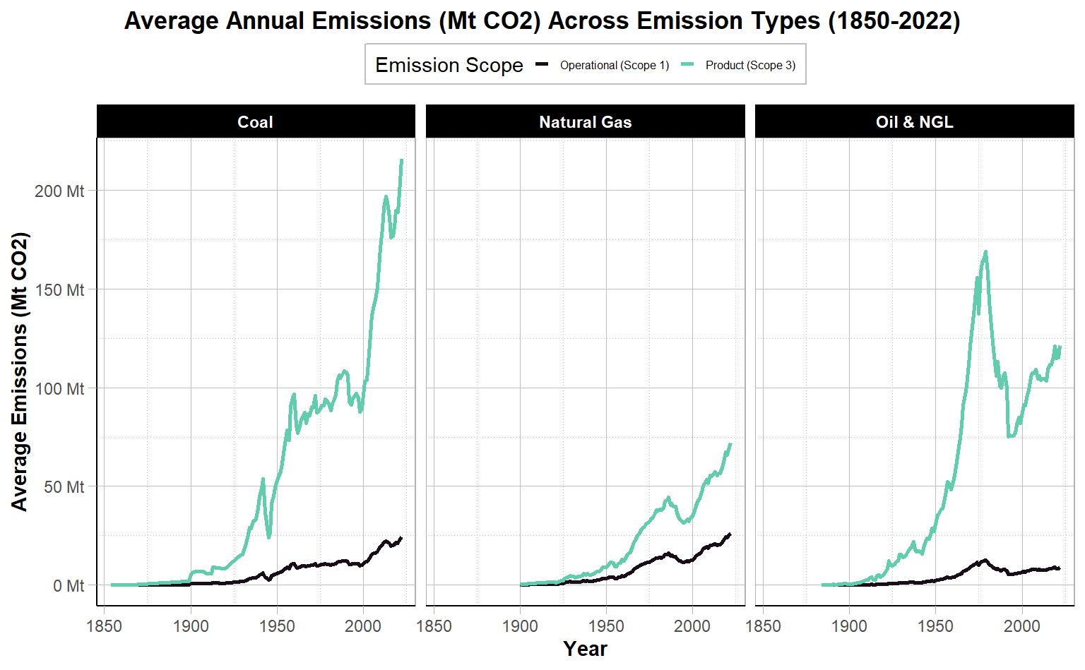 How do operational emissions (Scope 1) and emissions associated with the combustion of marketed products (Scope 3) differ over time across commodity and entity types?