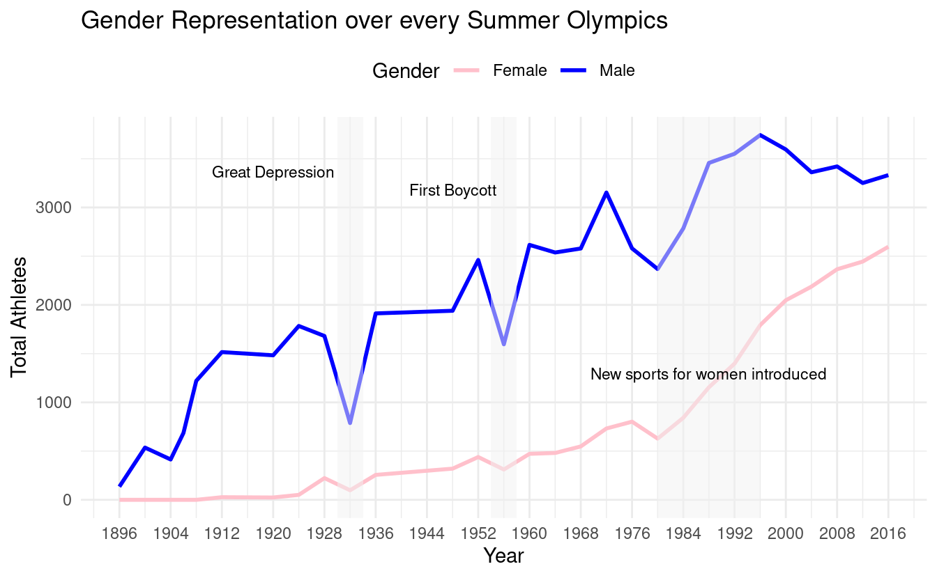 To evaluate the evolution of gender representation in the Olympics over Time by answering: