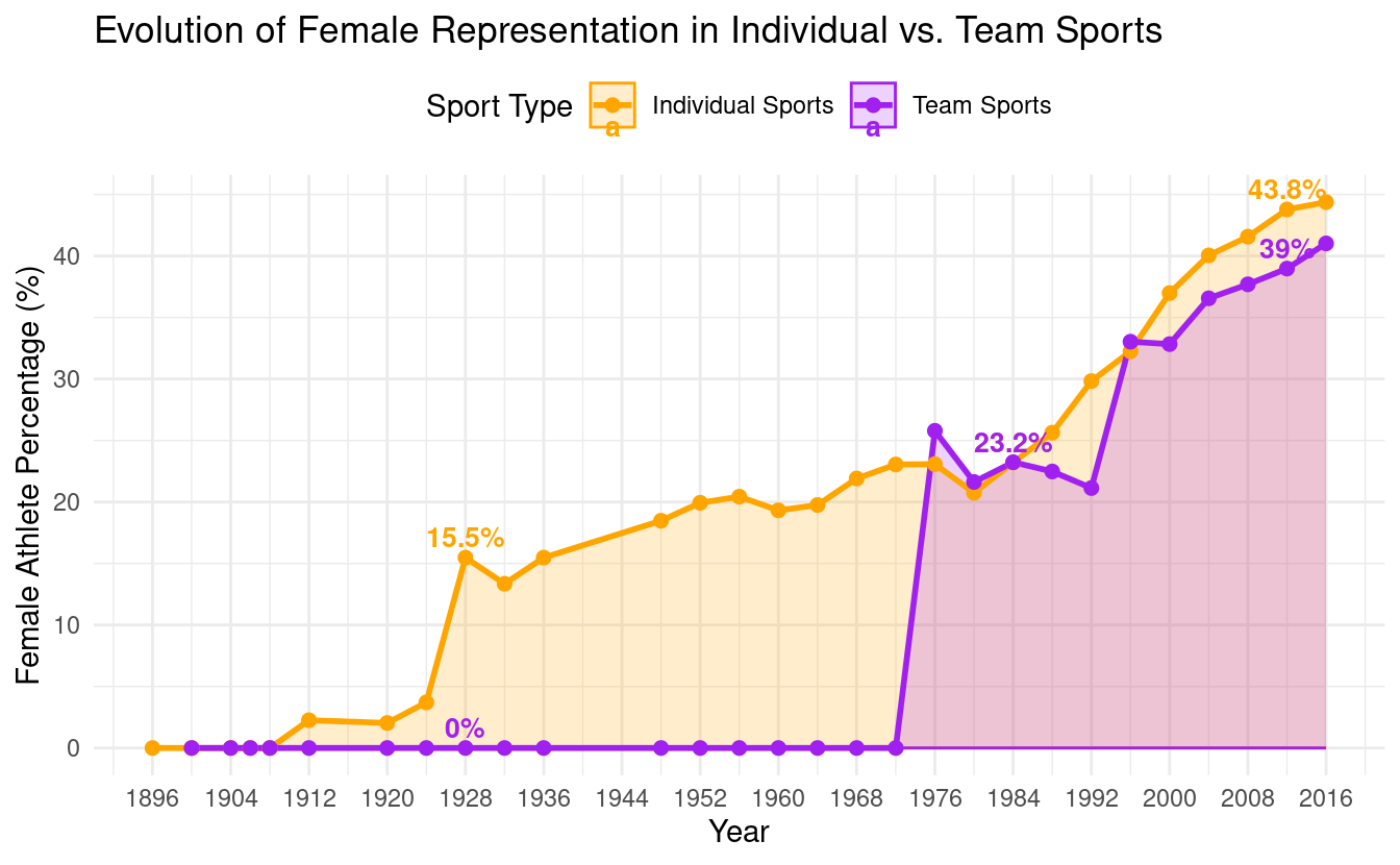 Early 1900s: Women competed mostly in individual sports like Swimming and Athletics