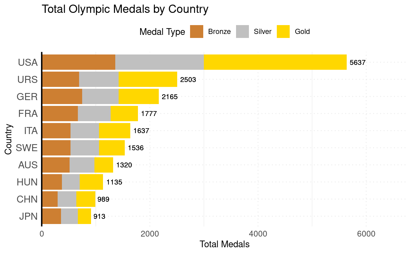 The graph visualizes global Olympic dominance through each nation’s historical medal success