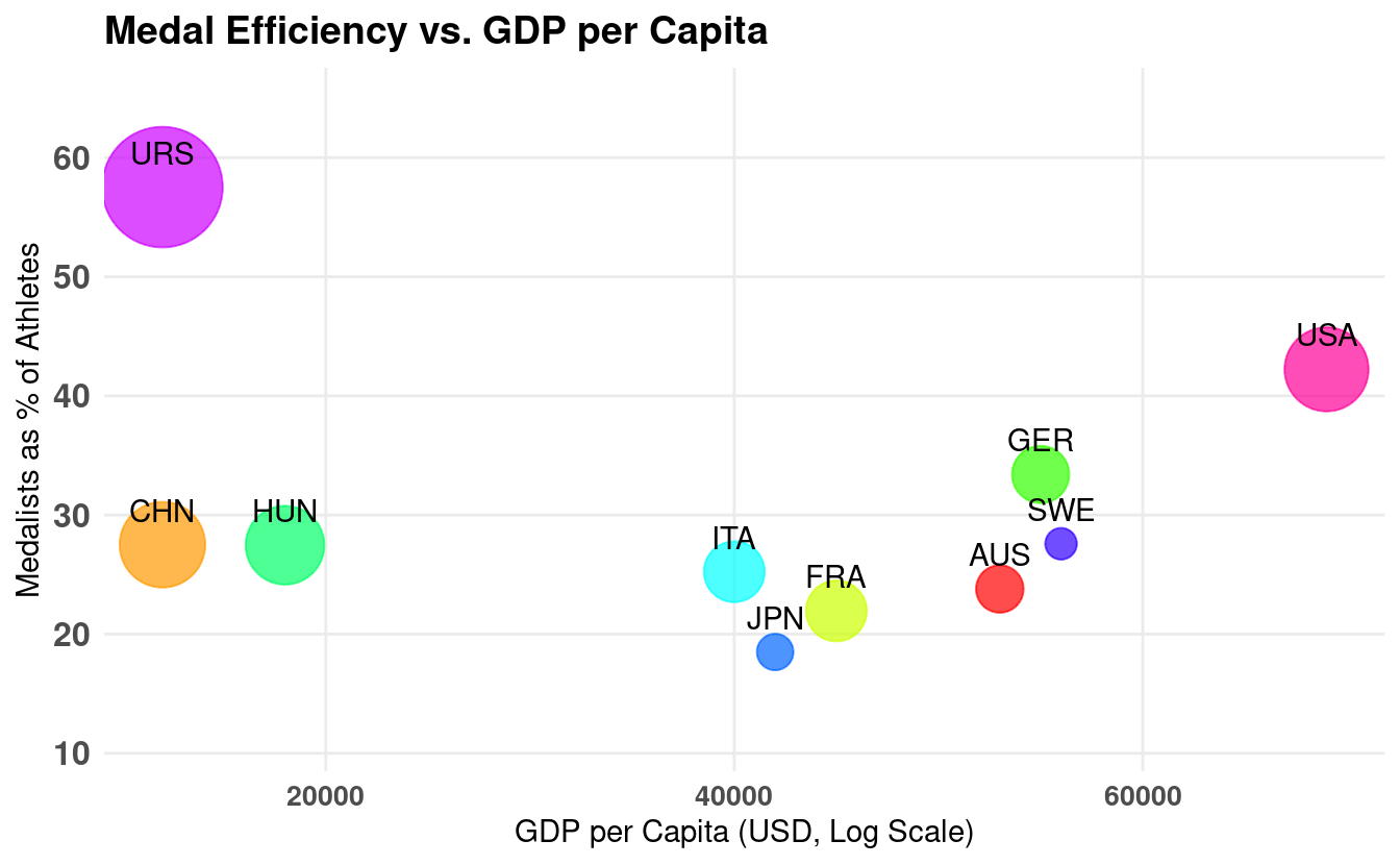 Does a country’s economic wealth (GDP per capita) influence its Olympic medal efficiency (percentage of athletes who win medals)?
